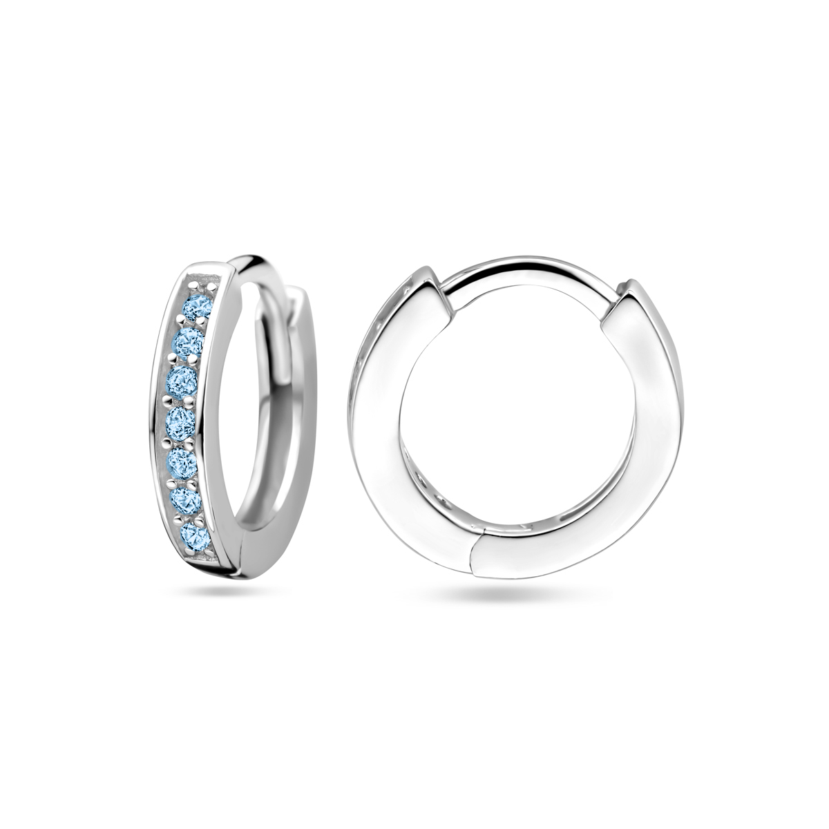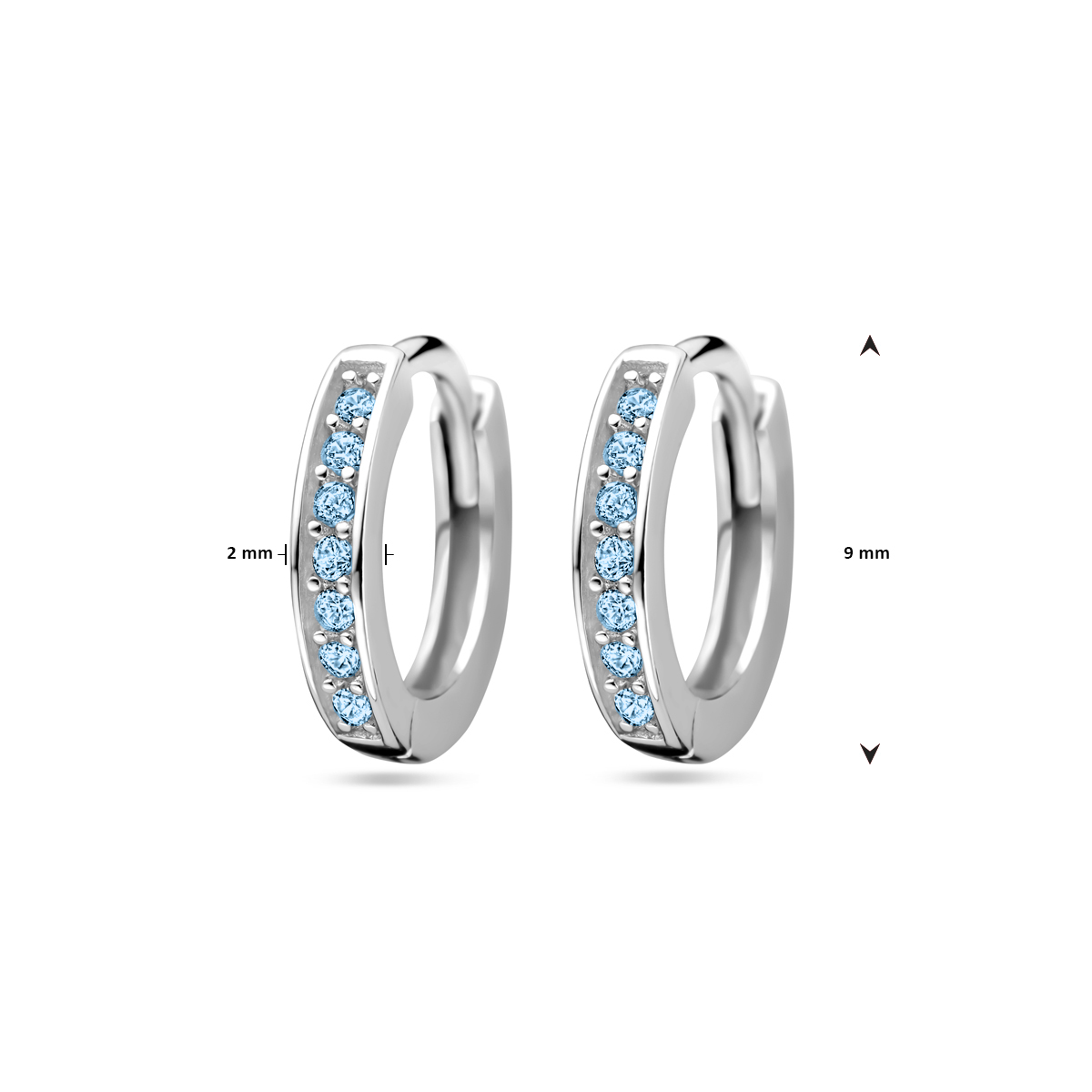 Gerhodineerd 925 zilveren klapoorringen uitgevoerd met een schitterende aqua blauwe zirkonia rij. De oorringen hebben een diameter van 9mm en een dikte van 2mm.