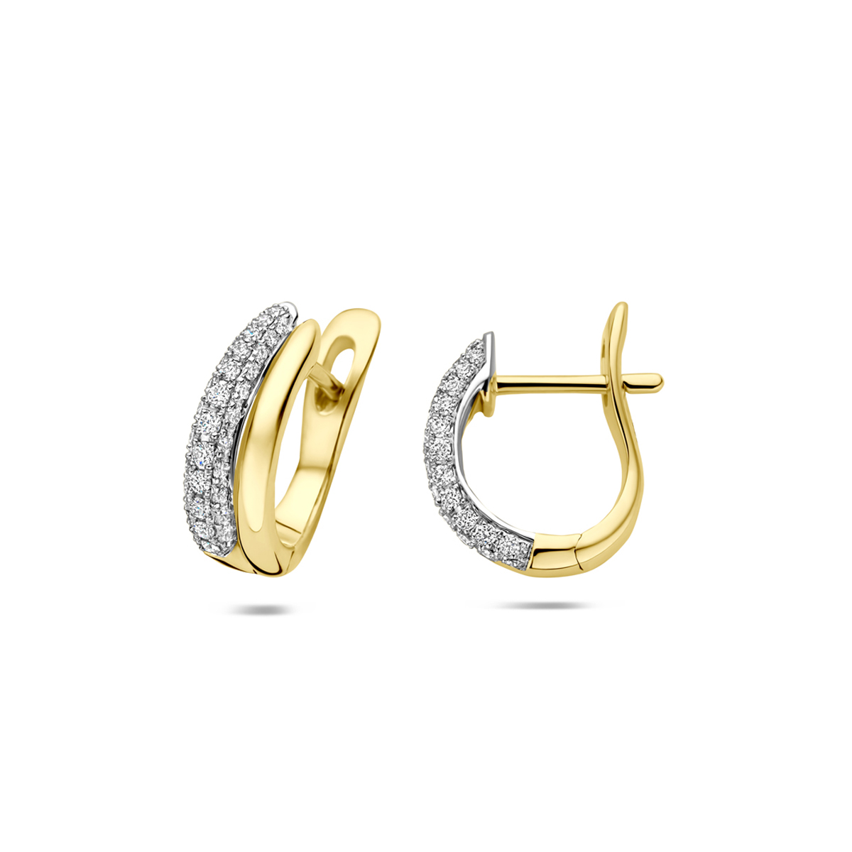 14k Bicolor geel en witgouden klapoorringen met diamant. De klapoorringen hebben een afmeting van 14x4mm. Het totale diamantgewicht is 0.27ct.