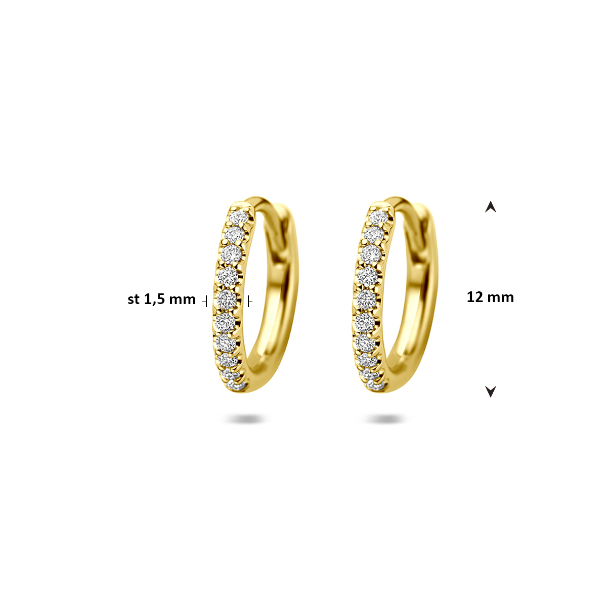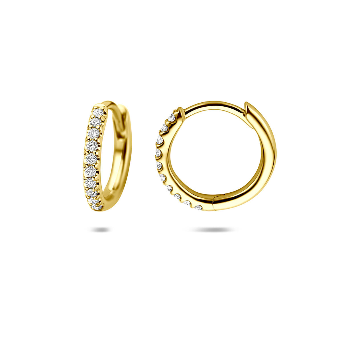 14k Geelgouden klapoorringen uitgevoerd met lab grown diamant. De klapoorringen hebben een diameter van 12mm. Het totale diamantgewicht is 0.14ct. Lab grown diamanten zijn diamanten die ontstaan in een laboratorium. Onder extreem hoge druk en temperatuur wordt het natuurlijk ontstaansproces nagebootst met als eindresultaat een diamant met dezelfde chemische eigenschappen maar met een andere oorsprong.