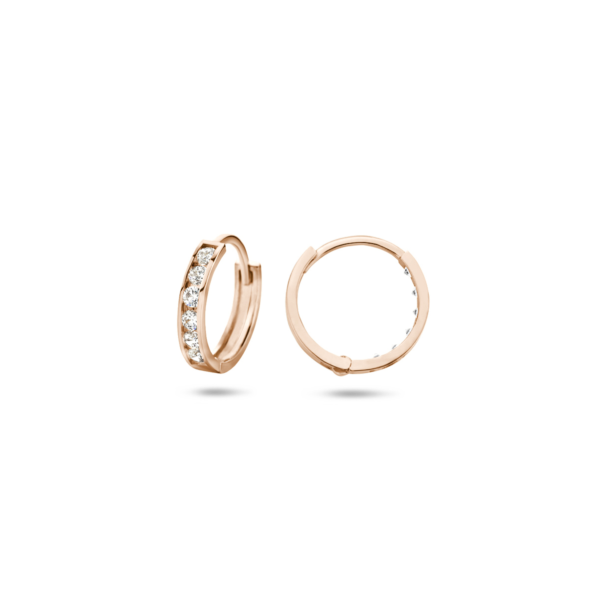 14k Rosegouden oorringen met scharnier uitgevoerd met een zirkonia rij. De afmeting van de oorringen is 11×2,3mm.