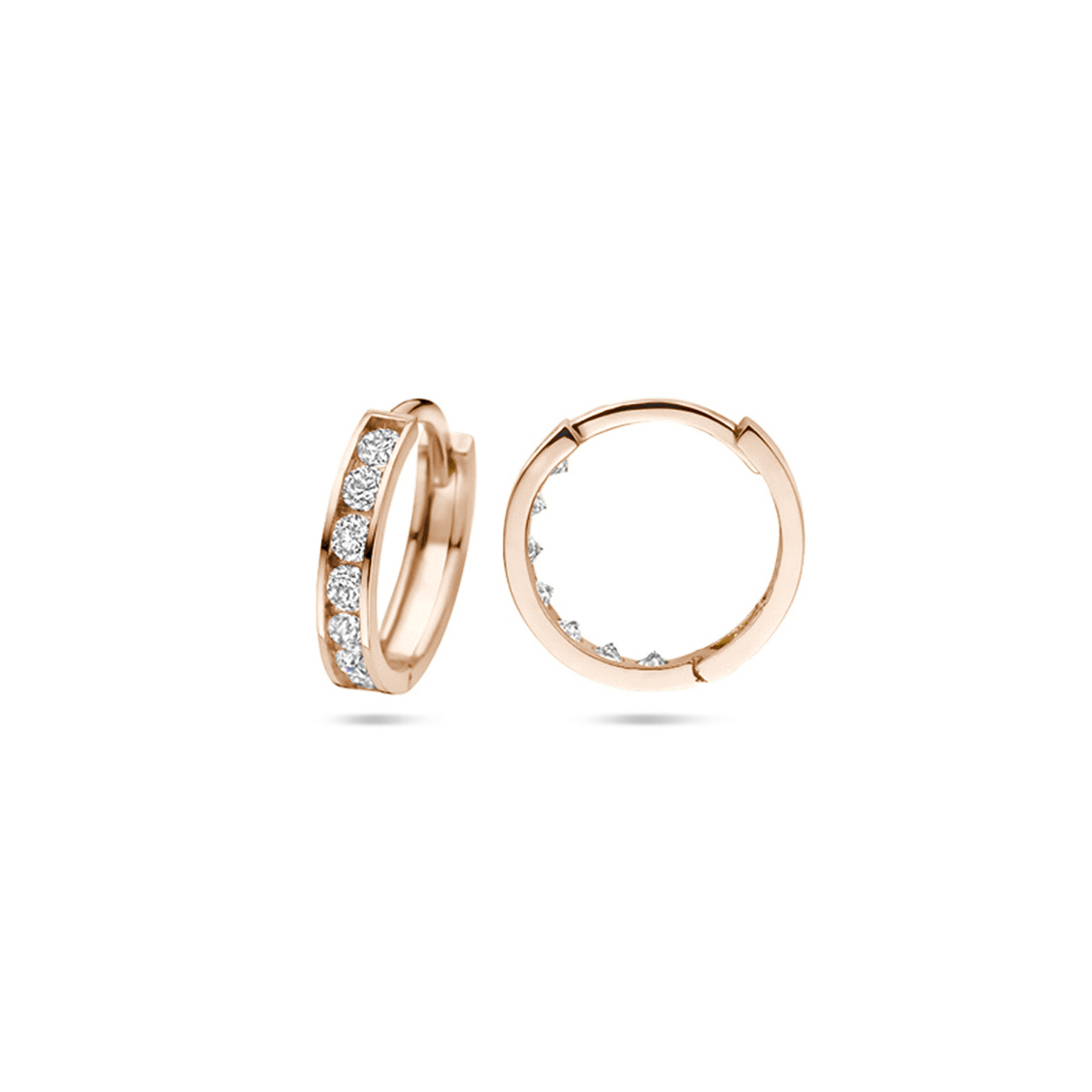 14k Rosegouden oorringen met scharnier uitgevoerd met een zirkonia rij. De afmeting van de oorringen is 12,5×2,5mm.