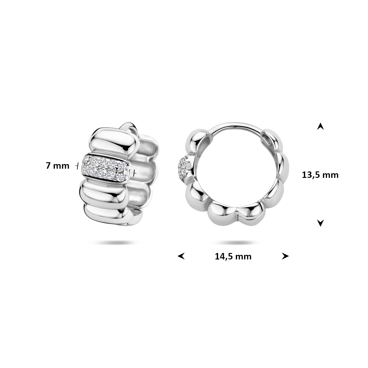 Gerhodineerd 925 zilveren klapoorringen uitgevoerd met zirkonia. De klapoorringen hebben een afmeting van 13.5×14.5mm en een dikte van 7mm.