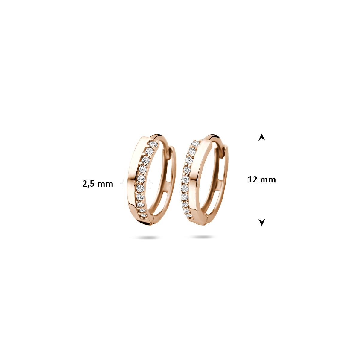 14k Rosegouden klapoorringen uitgevoerd met een schitterende zirkonia rij. De oorringen hebben een afmeting van 12×2.5mm.