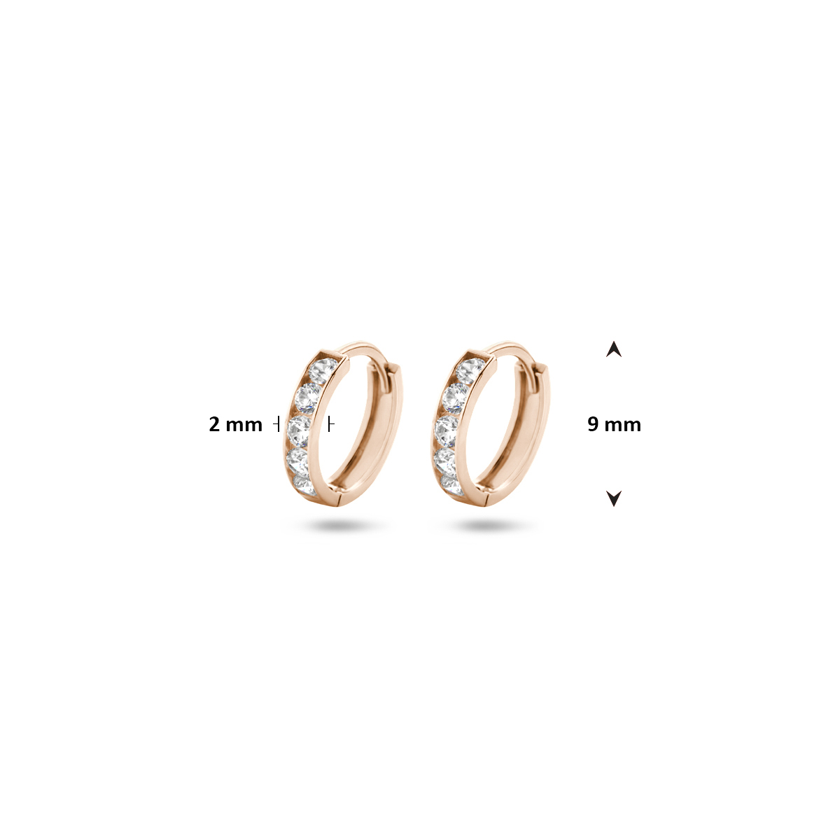 14k Rosegouden oorringen met scharnier uitgevoerd met een zirkonia rij. De afmeting van de oorringen is 9x2mm.