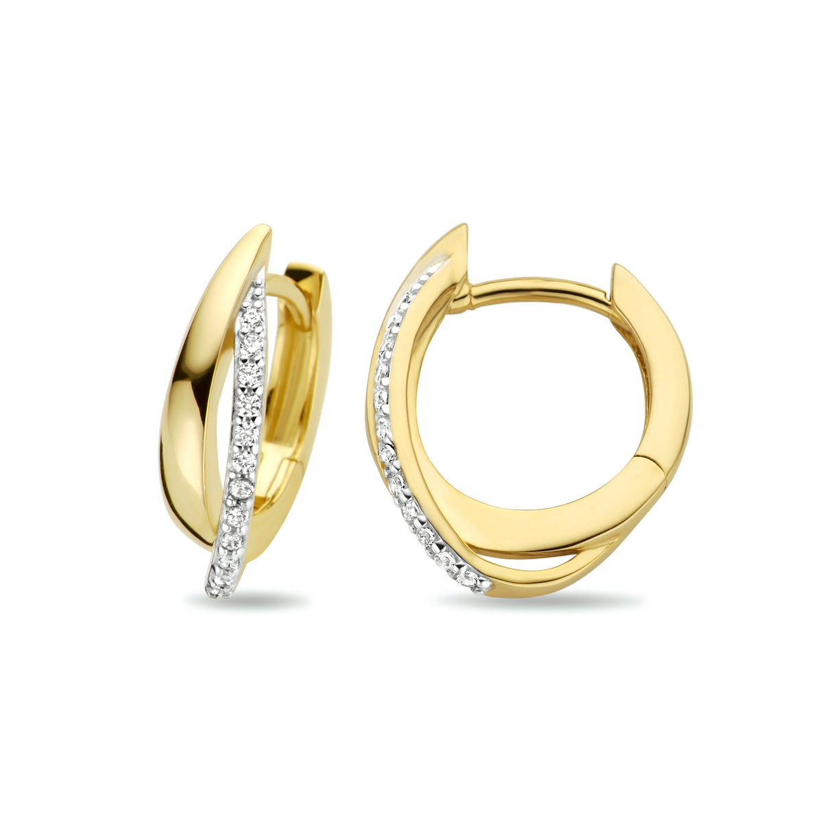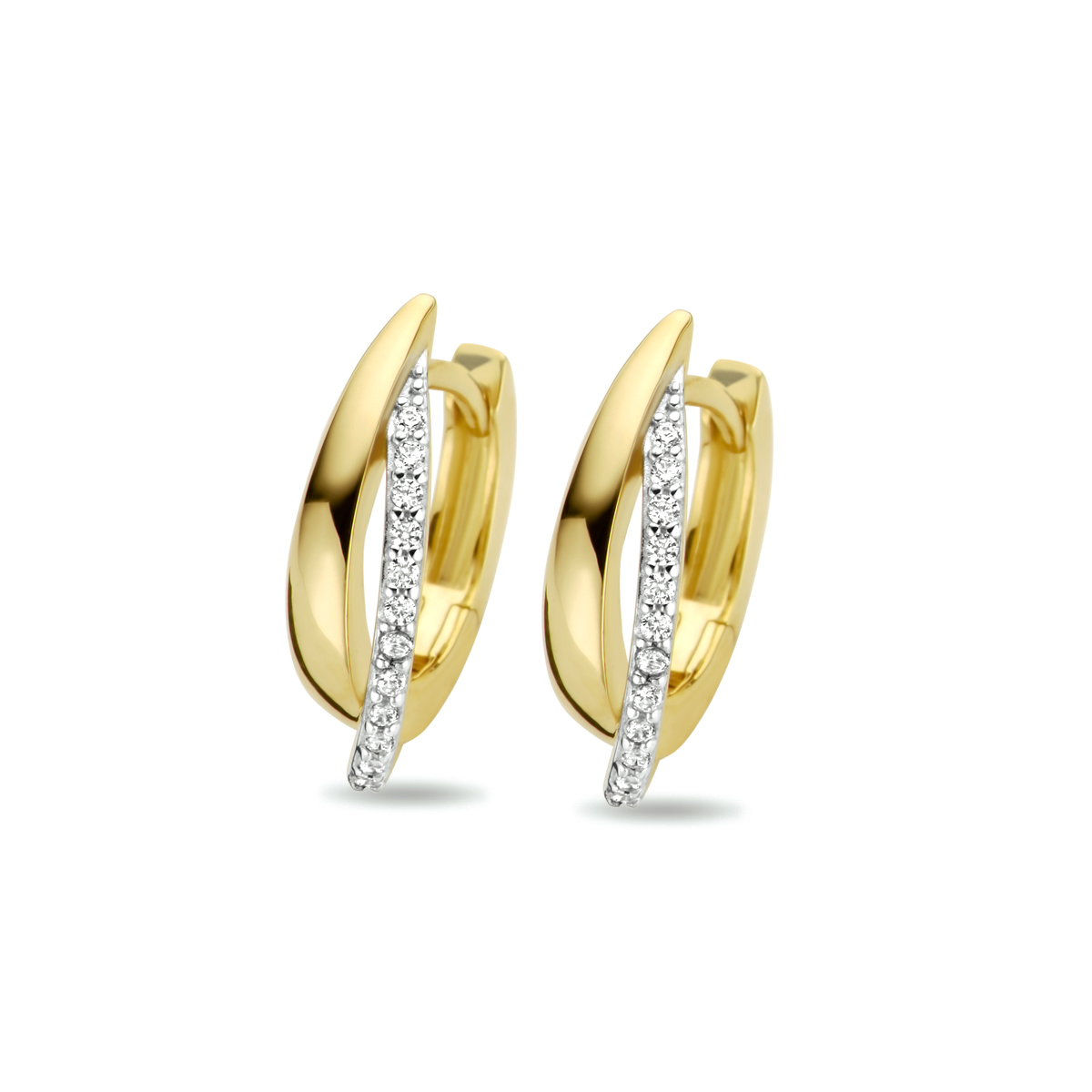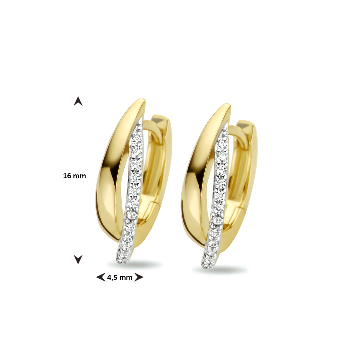 14k Geelgouden klapoorringen uitgevoerd met een schitterende zirkonia rij. De oorringen zijn bicolor gestift en hebben een afmeting van 16×4.5mm.