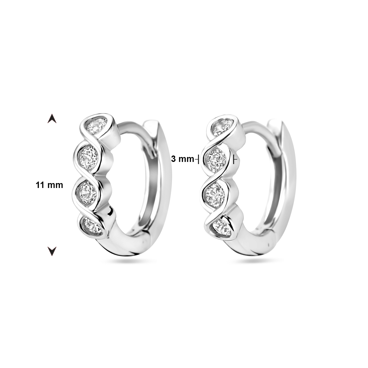 Gerhodineerd 925 zilveren klapoorringen uitgevoerd met zirkonia. De oorringen hebben een diameter van 11mm.