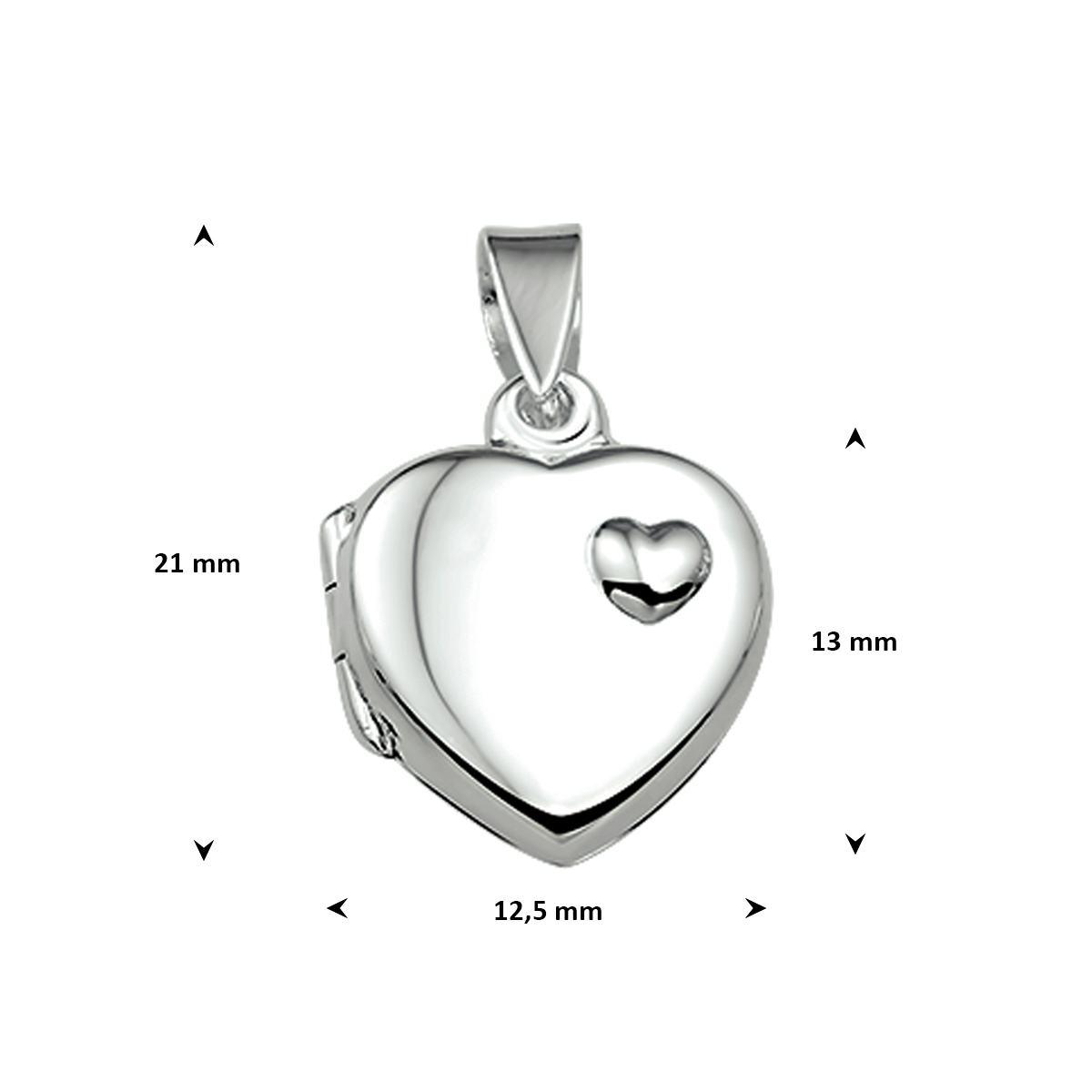 Zilveren hart medaillon met een hoogte van 13mm excl. oogje en een breedte van 12.5mm.