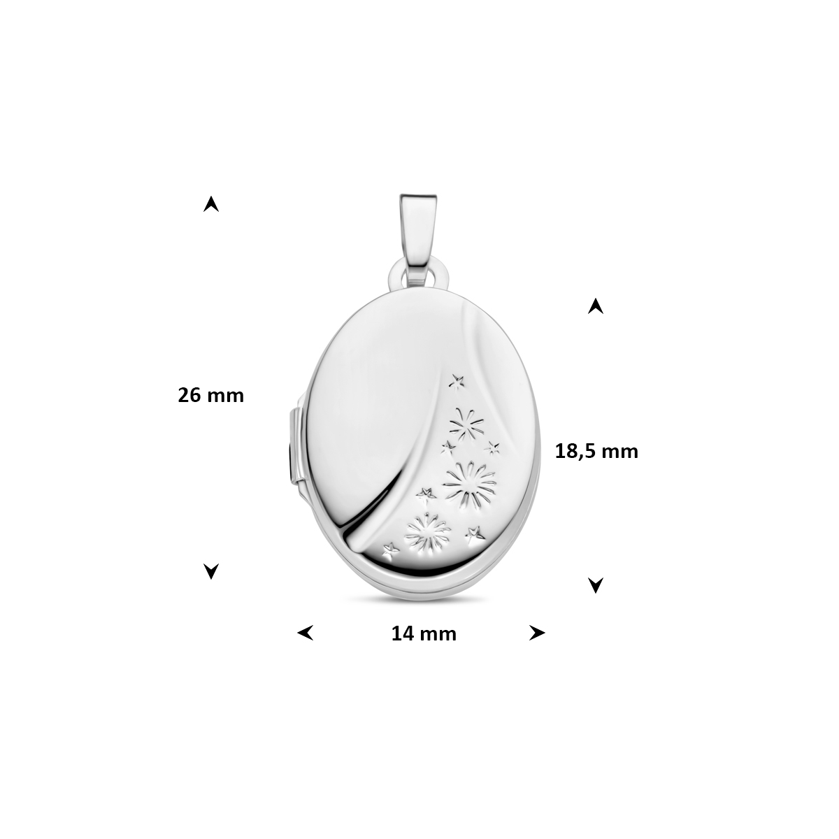 925 Zilveren medaillon met een hoogte van 18.5mm excl. oogje en een breedte van 14mm.