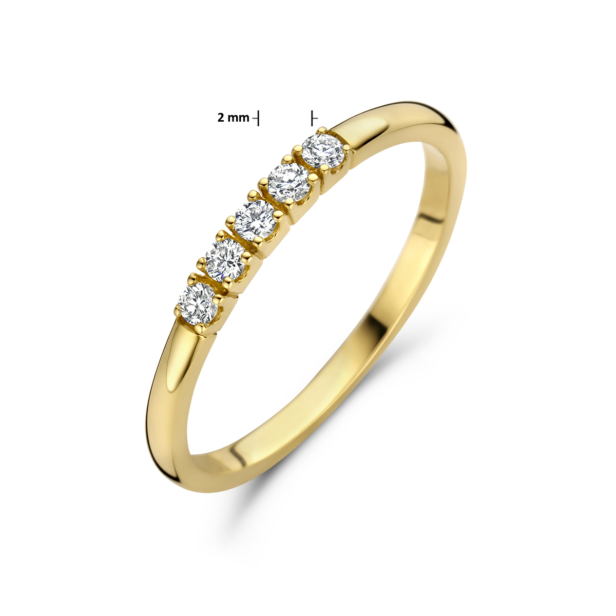 14k Geelgouden ring uitgevoerd met een diamant rij. De ring heeft een breedte van 2mm.