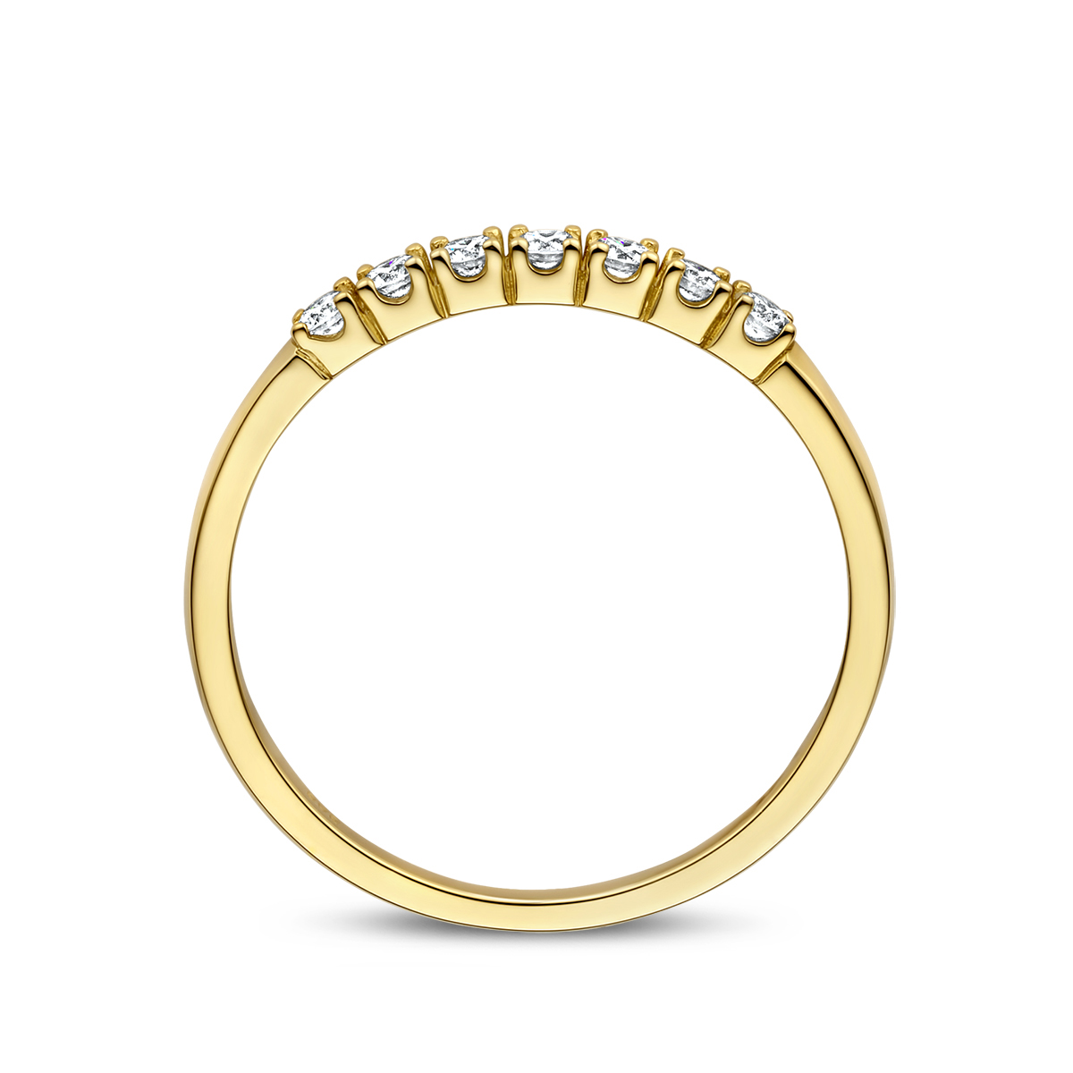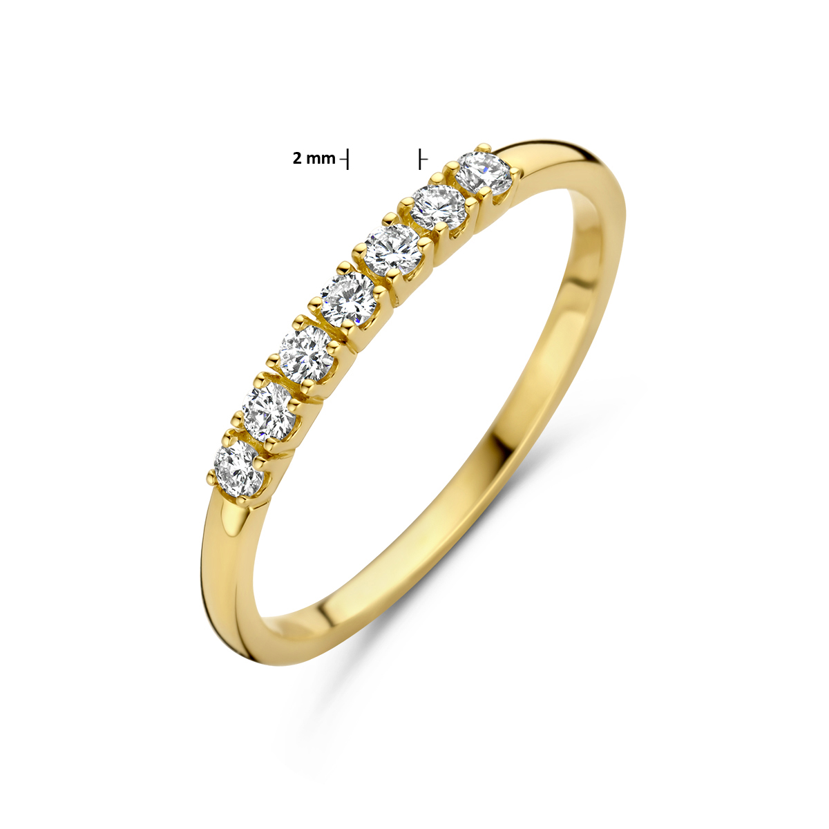 14k Geelgouden ring uitgevoerd met een diamant rij. De ring heeft een breedte van 2mm.