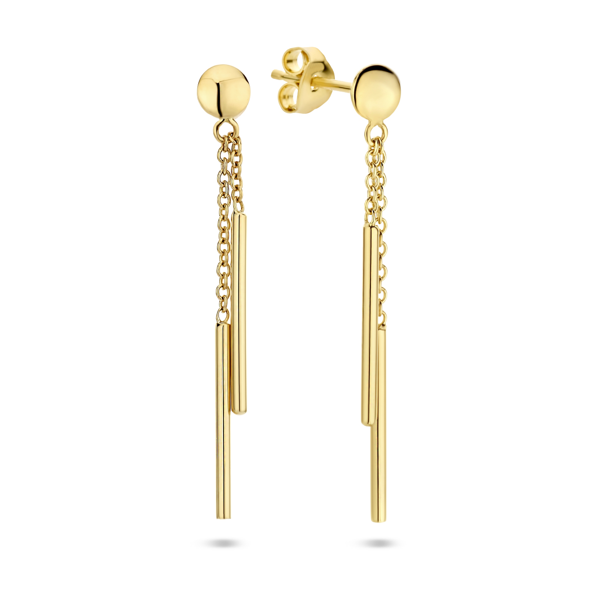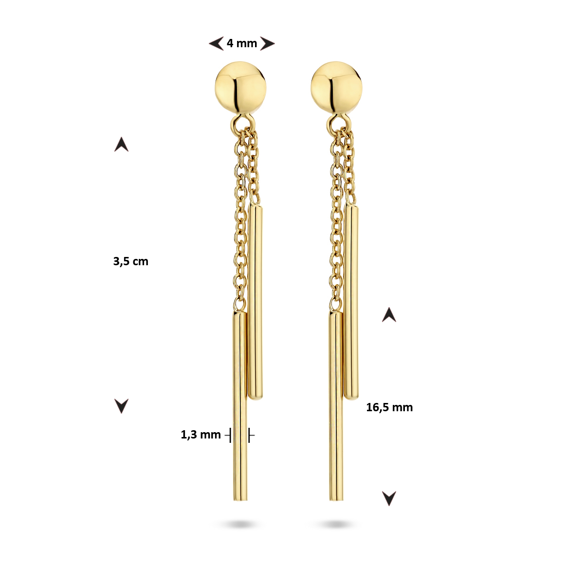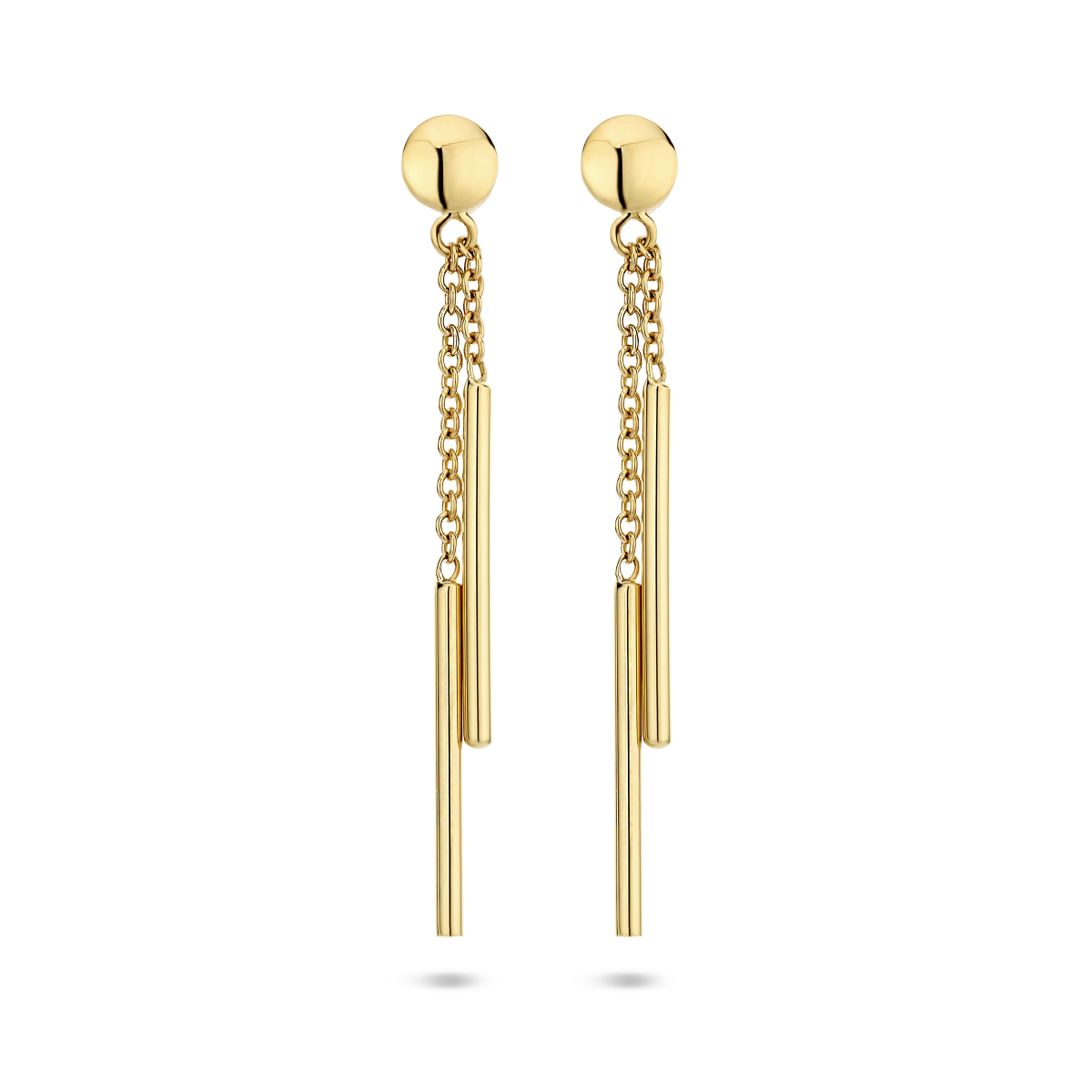 14k Geelgouden oorhangers uitgevoerd met twee balkjes van 16.5×1.3mm. De oorhangers hebben een totale hoogte van 3.5cm.
