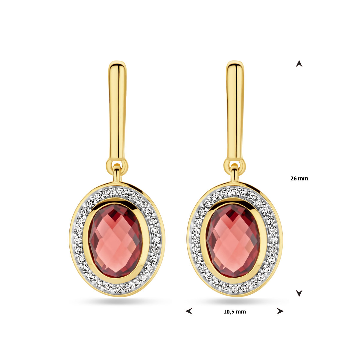 14k Geelgouden oorhangers uitgevoerd met granaat en diamant. De oorhangers hebben een totale hoogte van 26mm. Uitgevoerd met karabijnsluiting.