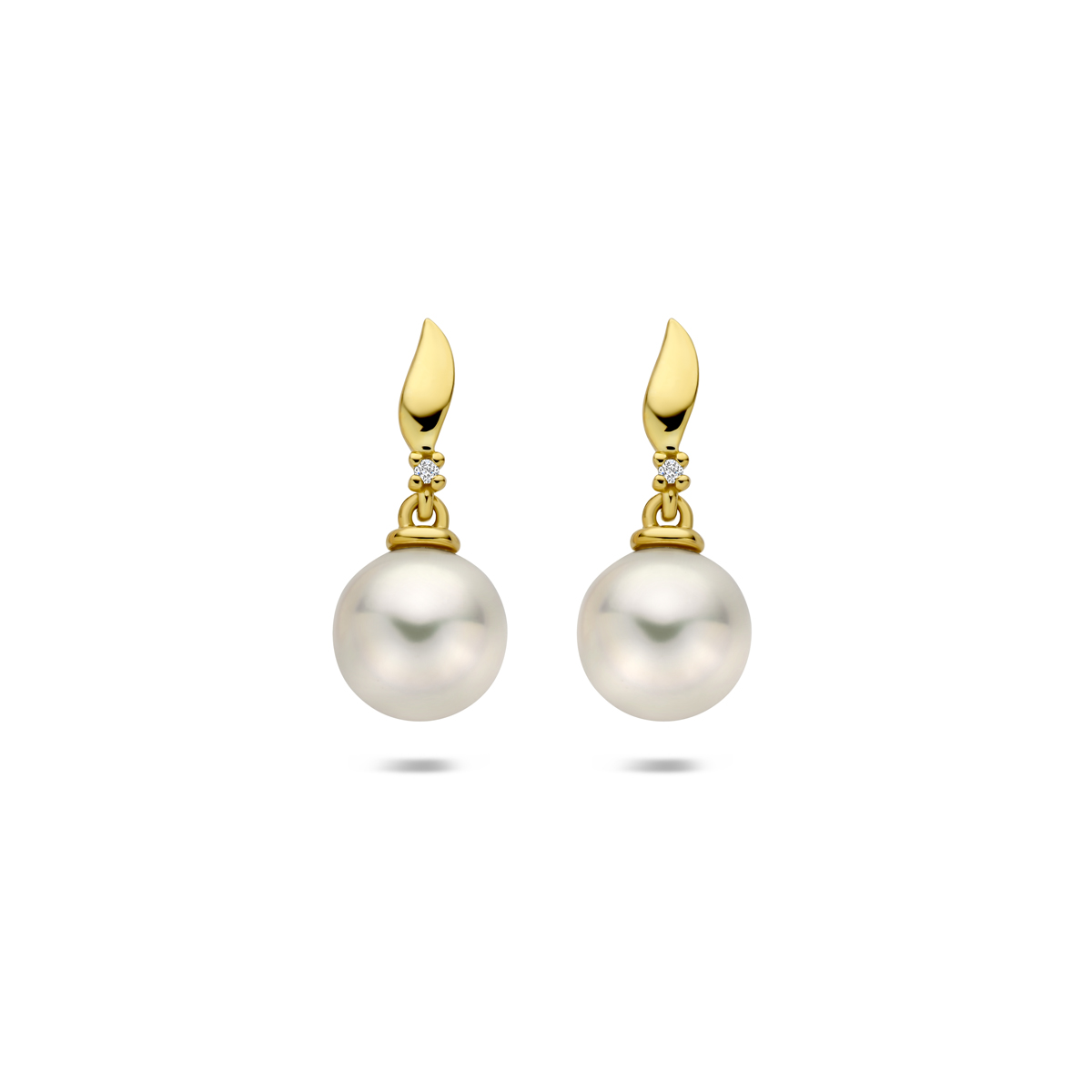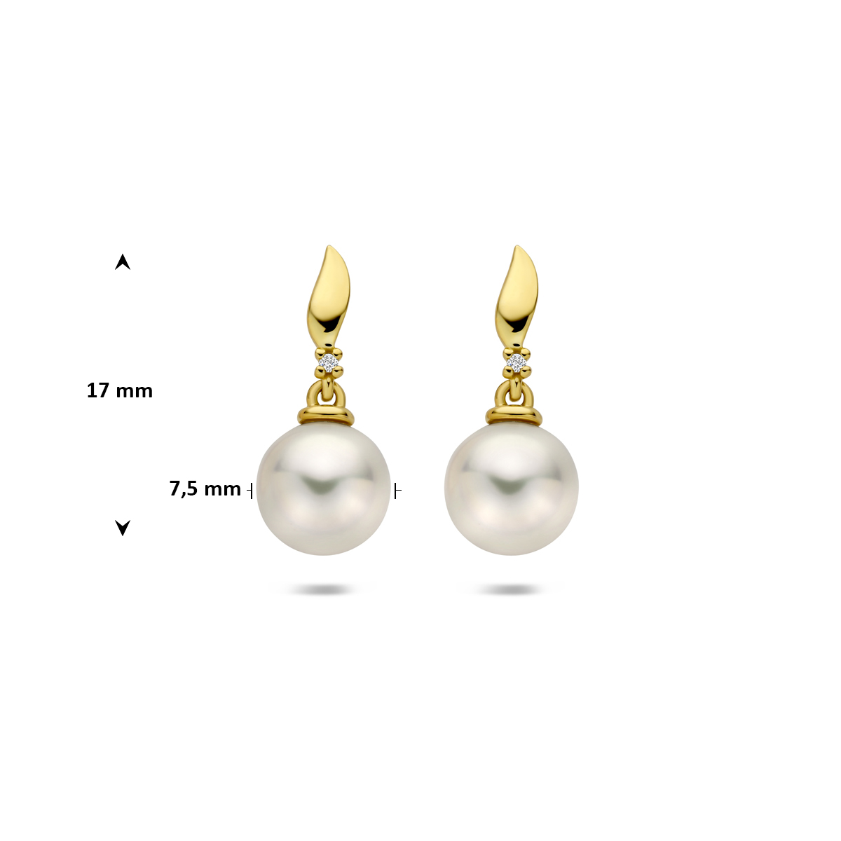 14k Geelgouden oorhangers uitgevoerd met diamant en een parel. De oorhangers hebben een totale hoogte van 17 mm. Het totale diamantgewicht is 0.01ct.