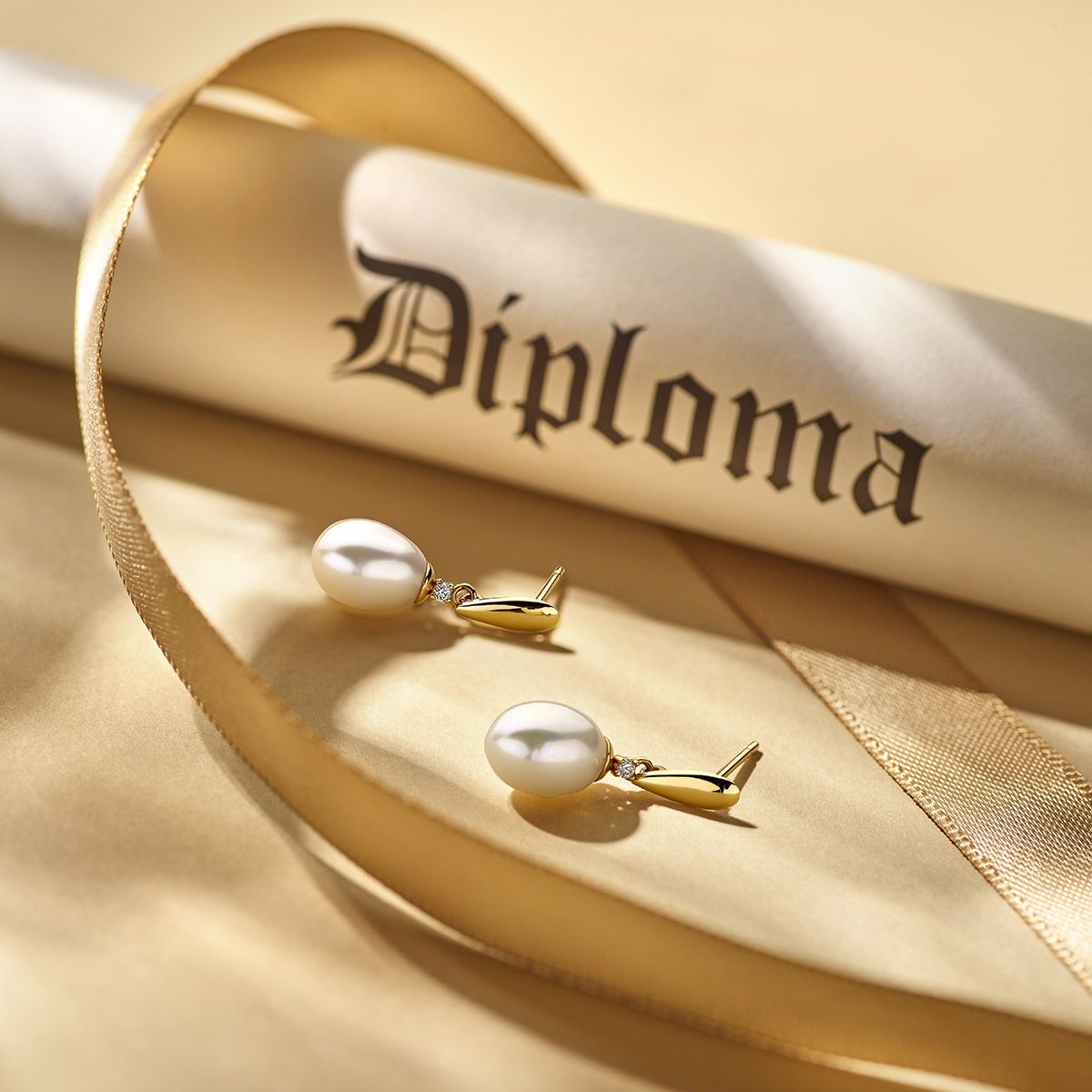 Geelgouden oorhangers met een zoetwaterparel en zirkonia. De oorhangers zijn onderdeel van een set.