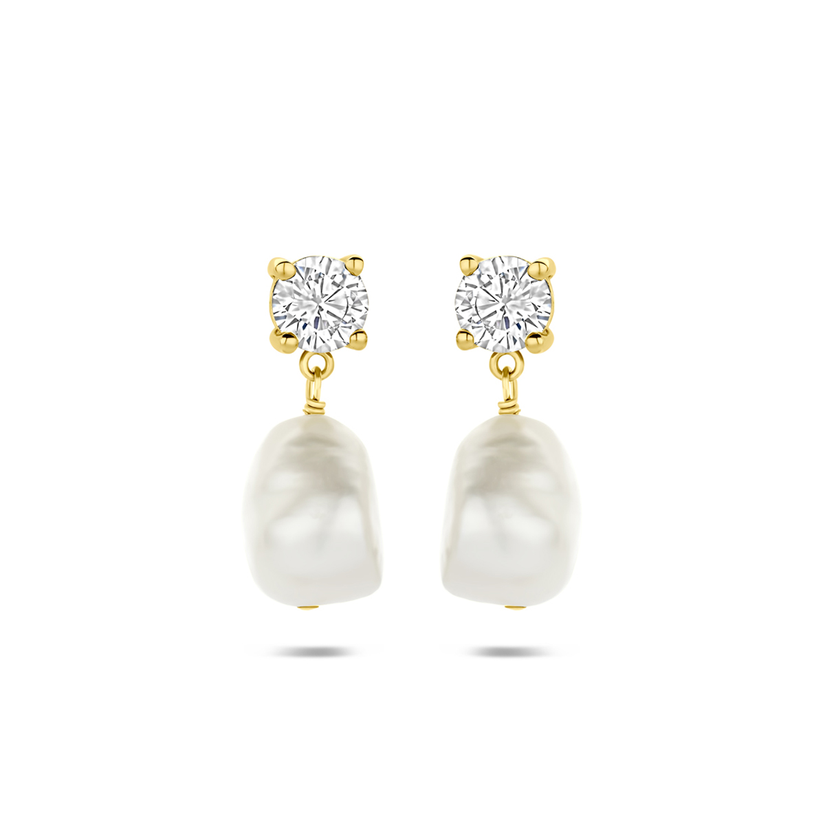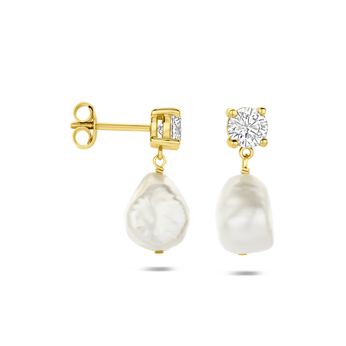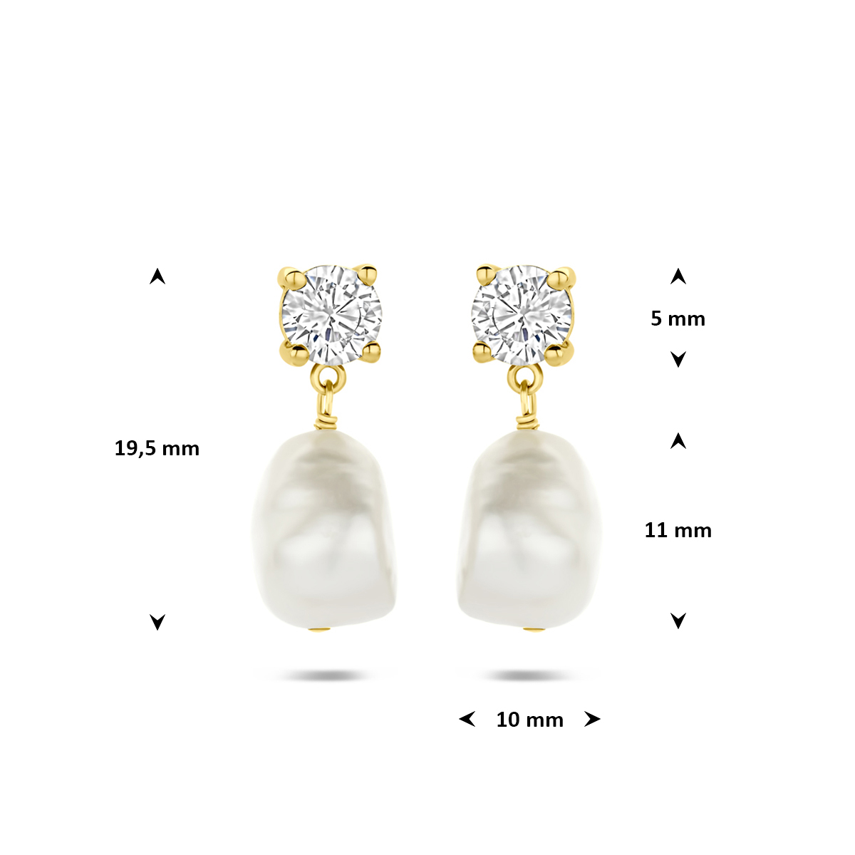 Verguld geel 925 zilveren oorhangers uitgevoerd met een parel en zirkonia. De oorhangers hebben een totale hoogte van 19,5mm. De maat van de parel is 11x10mm. Geen garantie op plating.