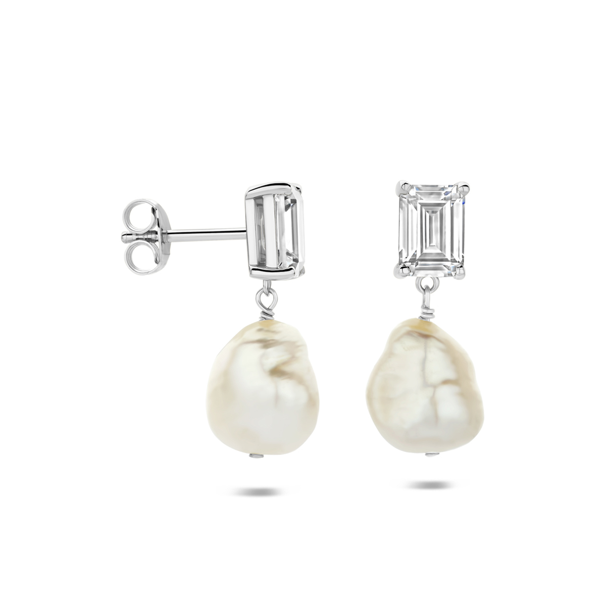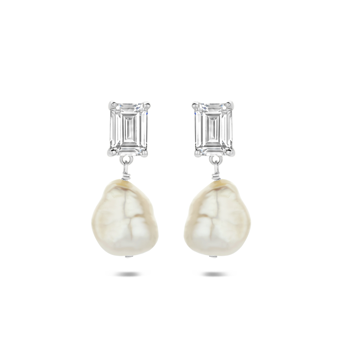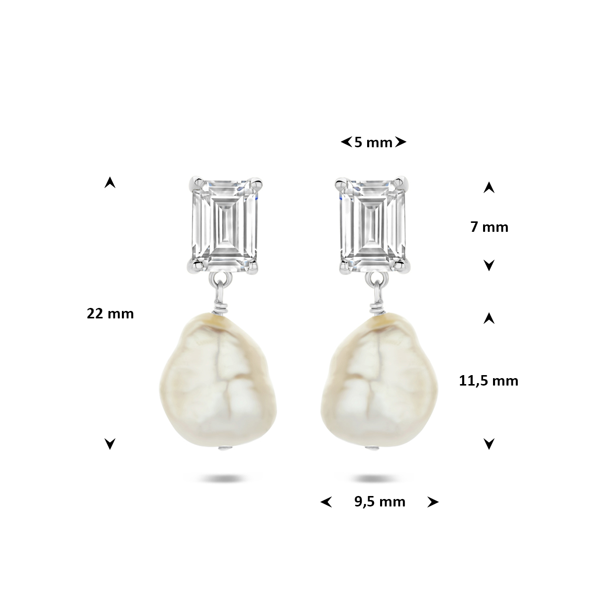 Gerhodineerd 925 zilveren oorhangers uitgevoerd met een parel en zirkonia. De oorhangers hebben een totale hoogte van 22mm. De maat van de parel is 11.5×9.5mm.