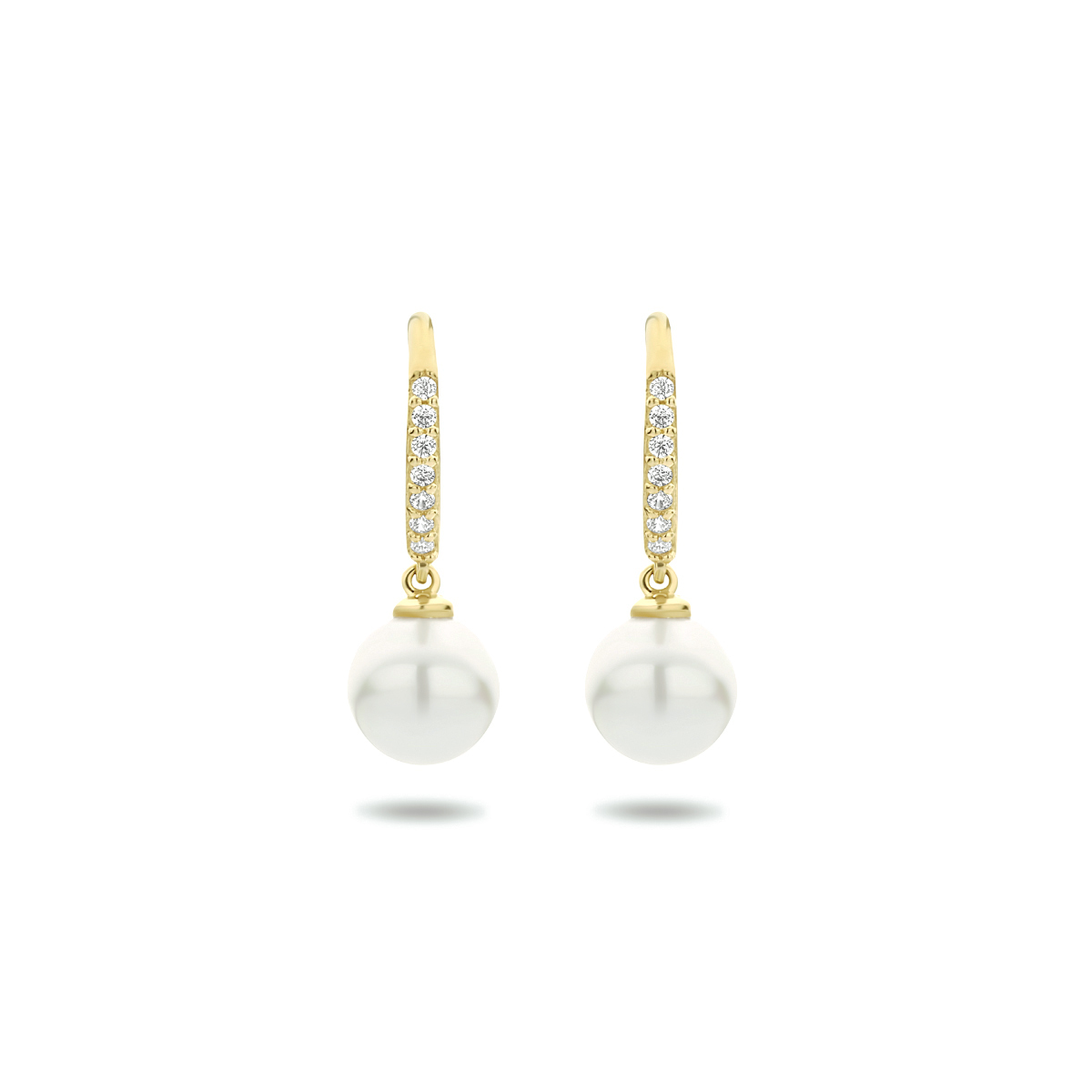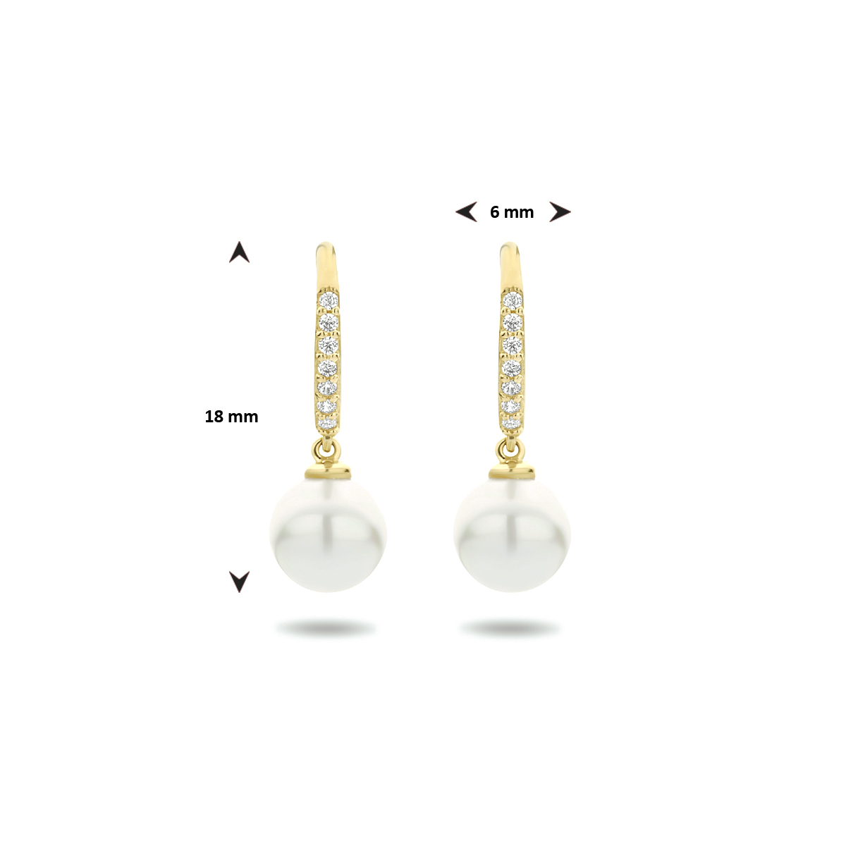 14k Geelgouden oorhangers uitgevoerd met een schitterende zirkonia rij en een zoetwaterparel. De oorhangers hebben een totale hoogte van 1.8cm en een breedte van 6mm.