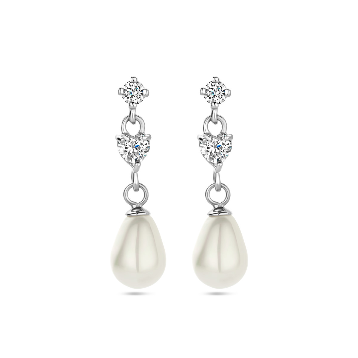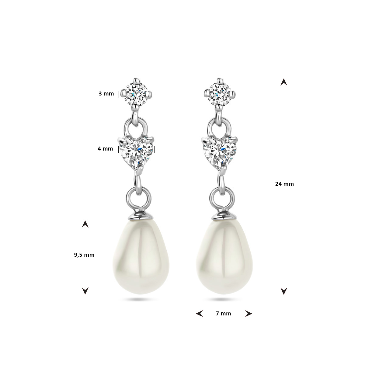 Gerhodineerd 925 zilveren oorhangers uitgevoerd met zirkonia en parel. De oohangers hebben een totale hoogte van 24mm.