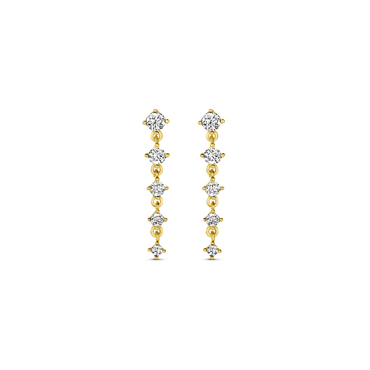 14k Geelgouden oorhangers uitgevoerd met zirkonia. De oorhangers hebben een afmeting van 19x3mm.