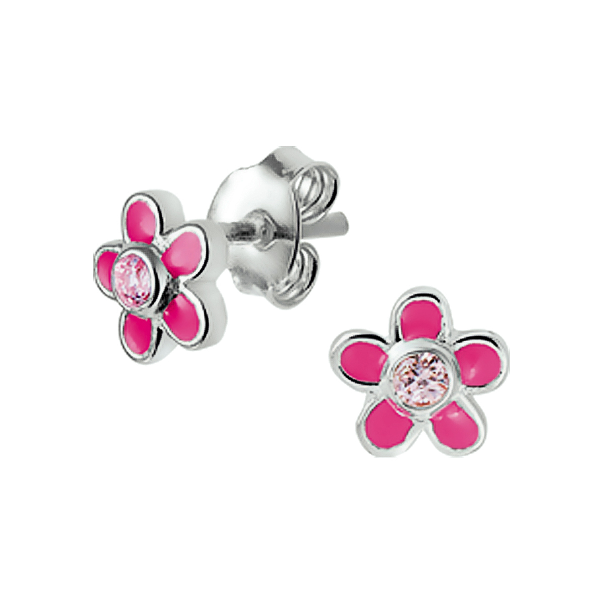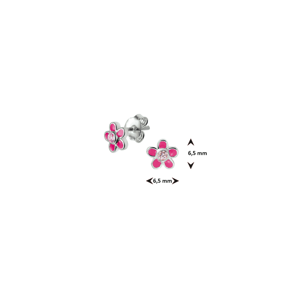 Zilveren oorknoppen met een bloem van roze emaille en zirkonia. De oorknoppen zijn onderdeel van een set.