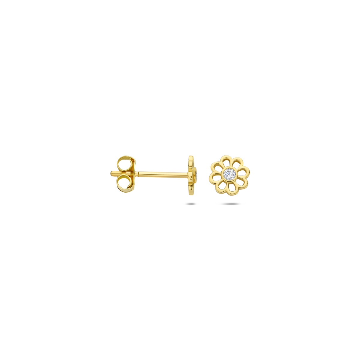 Geelgouden oorknoppen in de vorm van een bloem met een diameter van 5mm en uitgevoerd met een briljant geslepen zirkonia in een zetkast.