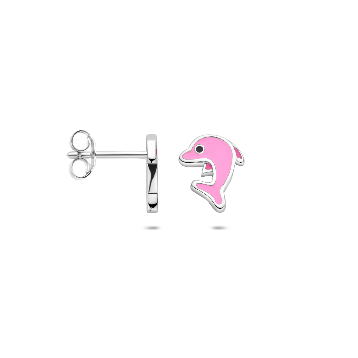 Gerhodineerd zilveren in roze uitgevoerde dolfijn oorknoppen met een afmeting van 10×7.5mm.