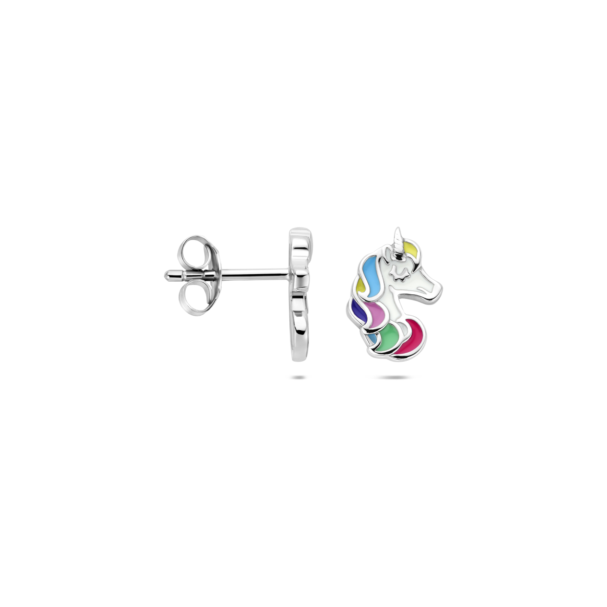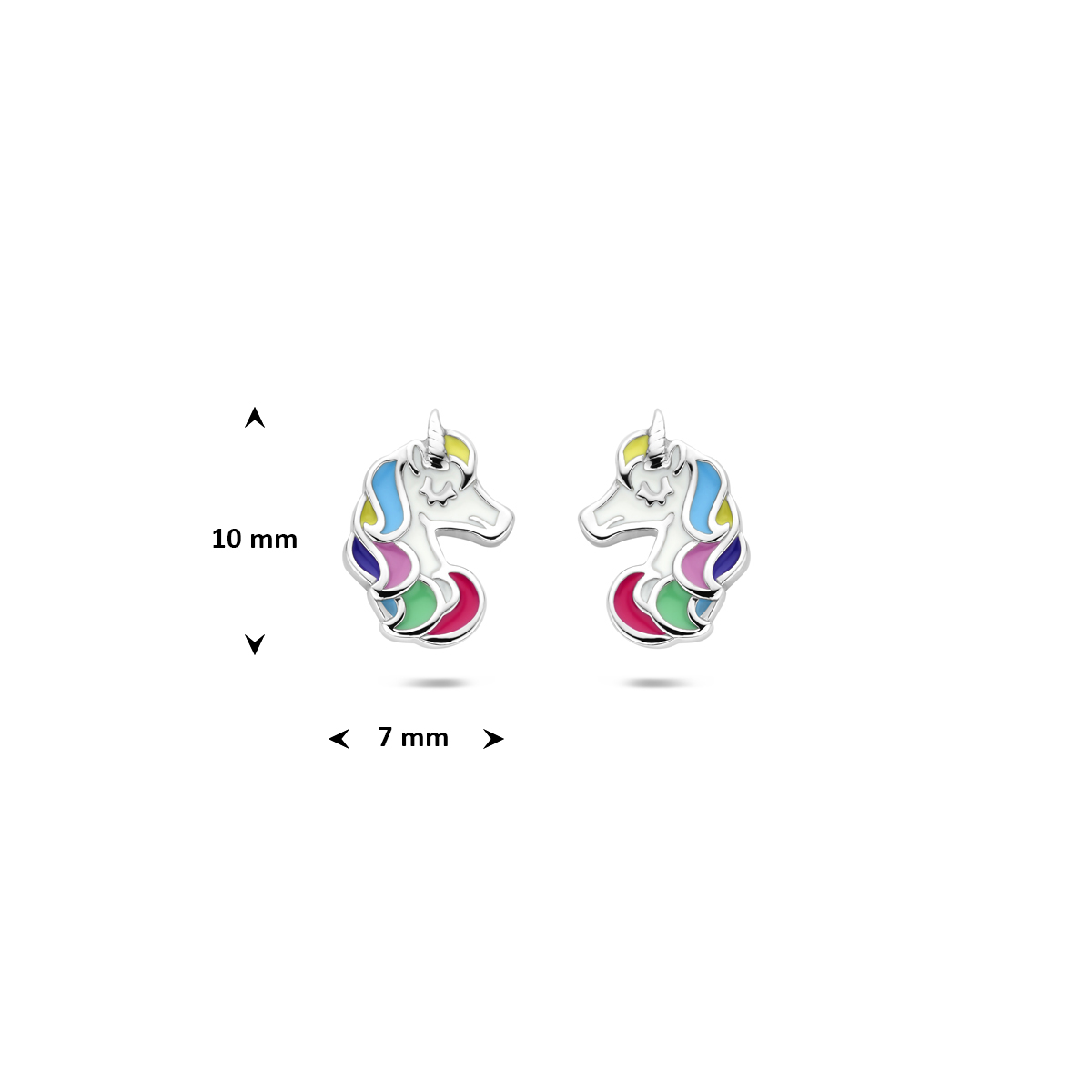 Gerhodineerd 925 zilveren oorknoppen in de vorm van een eenhoorn, uitgevoerd met gekleurd emaille. De oorknoppen hebben een afmeting van 10x7mm.