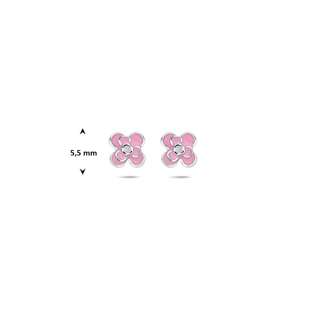 Gerhodineerd 925 zilveren oorknoppen uitgevoerd met zirkonia en roze emaille. De oorknoppen hebben een diameter van 5.5mm.
