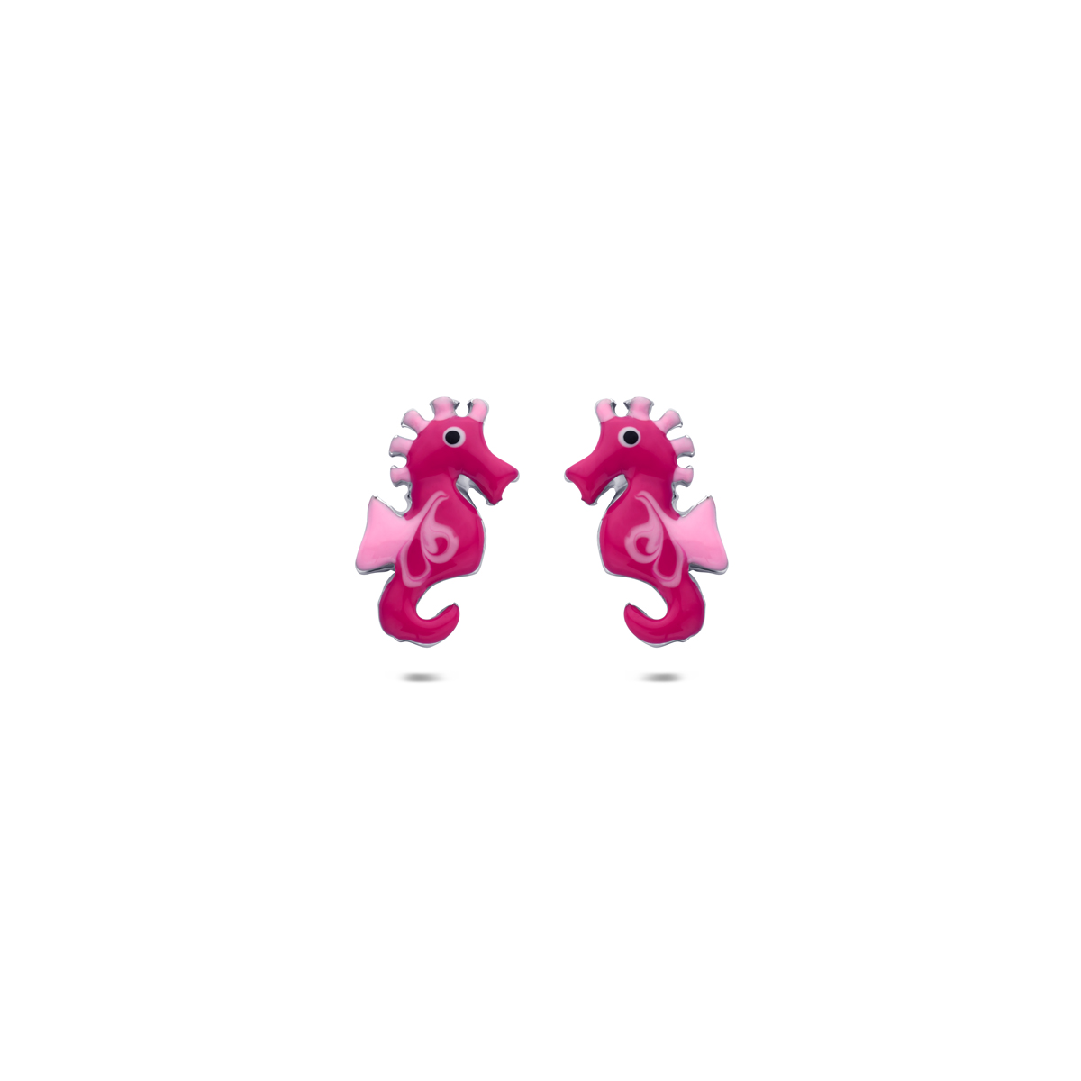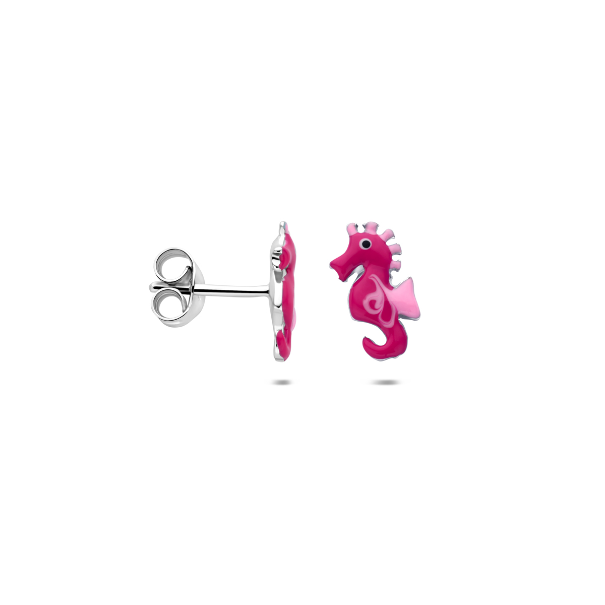 Gerhodineerd 925 zilveren oorknoppen uitgevoerd in de vorm van een zeepaardje. De oorknoppen hebben een afmeting van 10,5×5,5mm.