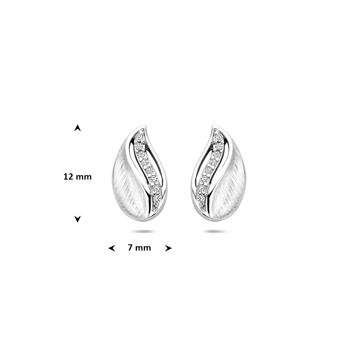 Gerhodineerd zilveren oorknoppen met zirkonia en een poli/gescratchte bewerking. De oorknoppen hebben een afmeting van 12x7mm.
