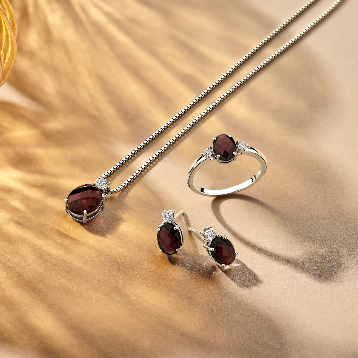 Gerhodineerd 925 zilveren oorknoppen uitgevoerd met granaat en zirkonia. De oorknoppen hebben een afmeting van 10.5x6mm.