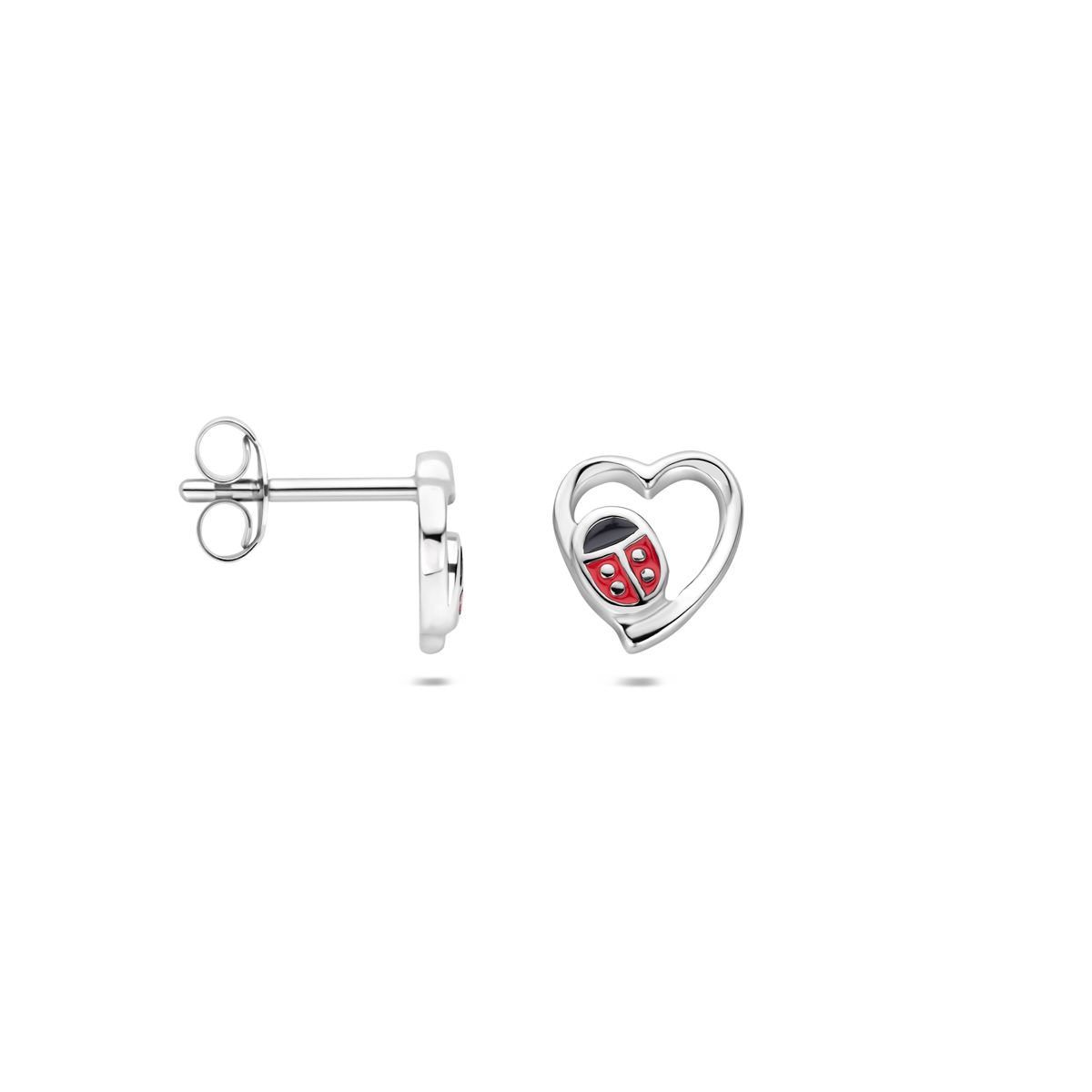Gerhodineerd zilveren oorknoppen in de vorm van een hartje met een lieveheersbeestje in emaille. De oorknoppen hebben een afmeting van 7.5×7.5mm en is uitgevoerd met een stevige pouchette sluiting. Deze oorsieraden zijn te combineren met bijpassende sieraden uit onze collectie.