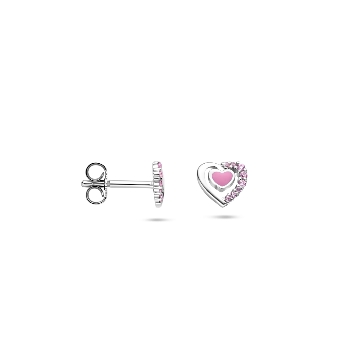 Gerhodineerd 925 zilveren oorknoppen uitgevoerd met hartjes en roze zirkonia. De oorknoppen hebben een afmeting van 6×6.5mm.