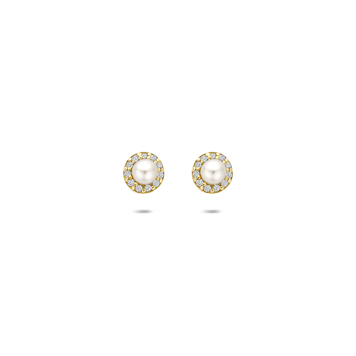 14k Geelgouden oorknoppen uitgevoerd met een parel en zirkonia rij. De oorknoppen hebben een diameter van 5mm.