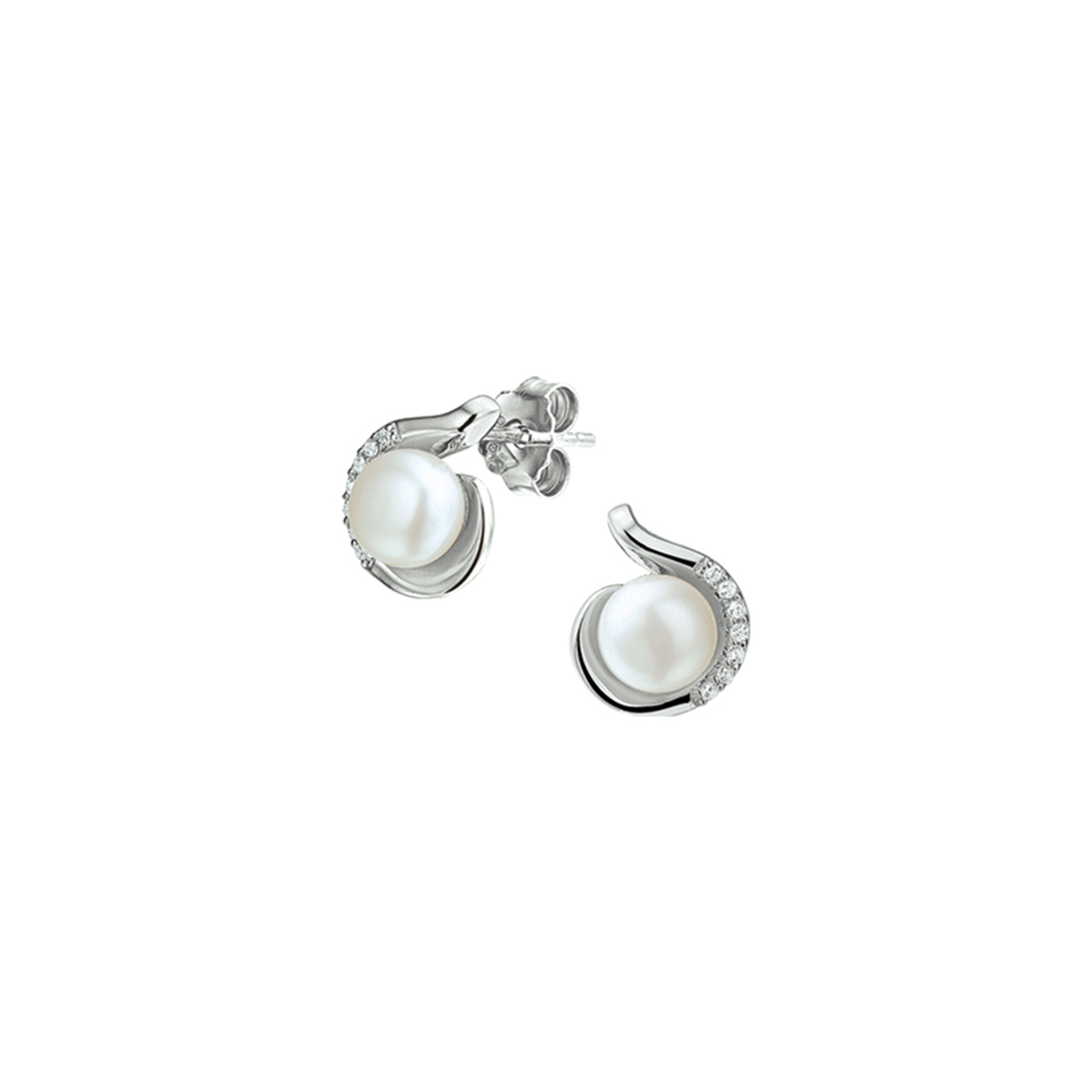 Gerhodineerd zilveren oorknoppen met zirkonia en zoetwaterparel. De oorknoppen zijn onderdeel van een set.