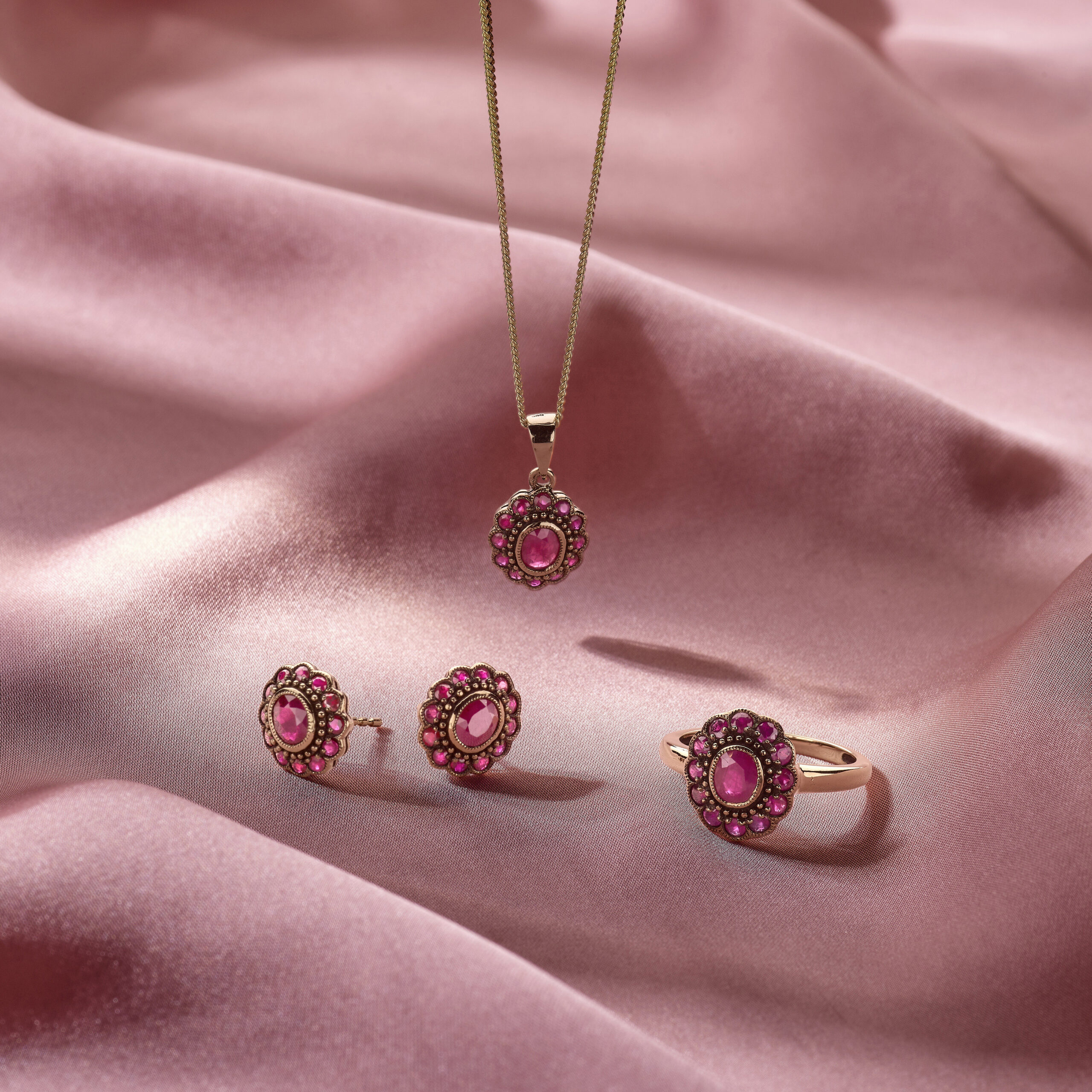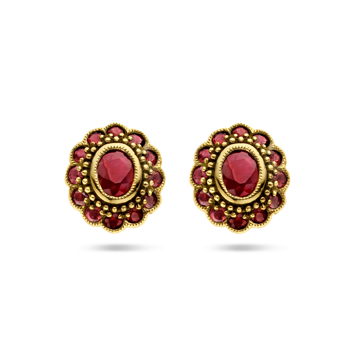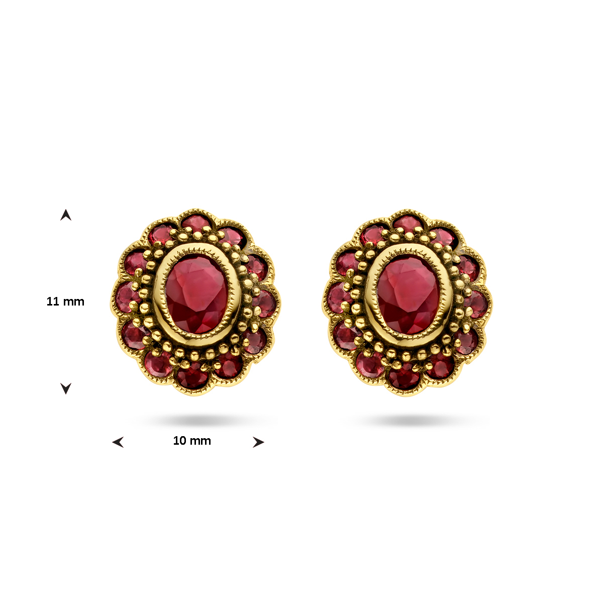 14k Geelgouden oorknoppen uitgevoerd met robijn stenen. De oorknoppen hebben een afmeting van 11x10mm.