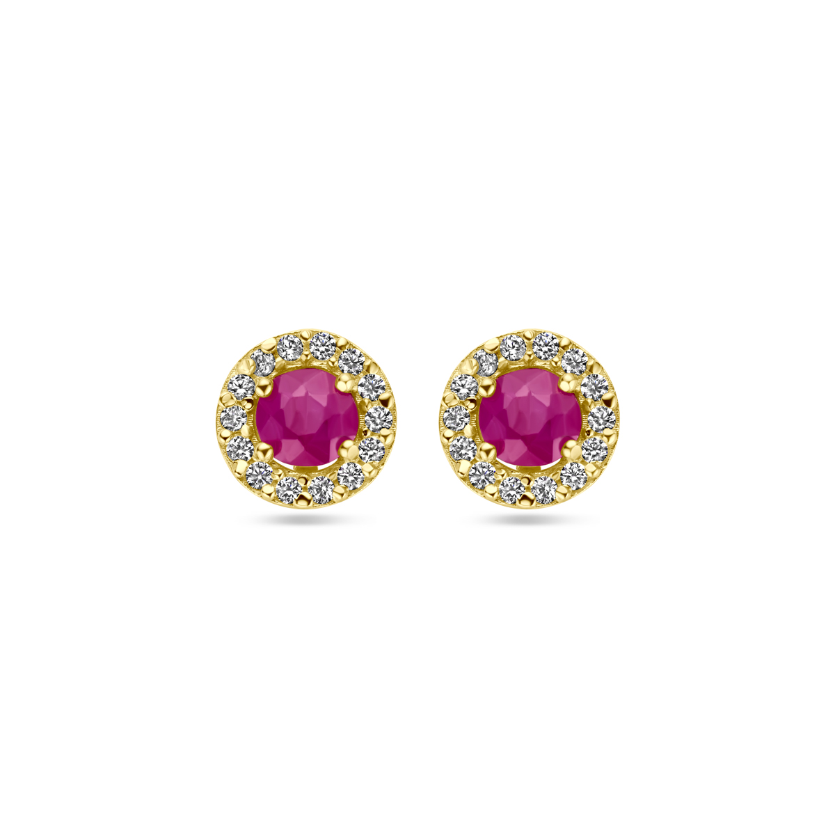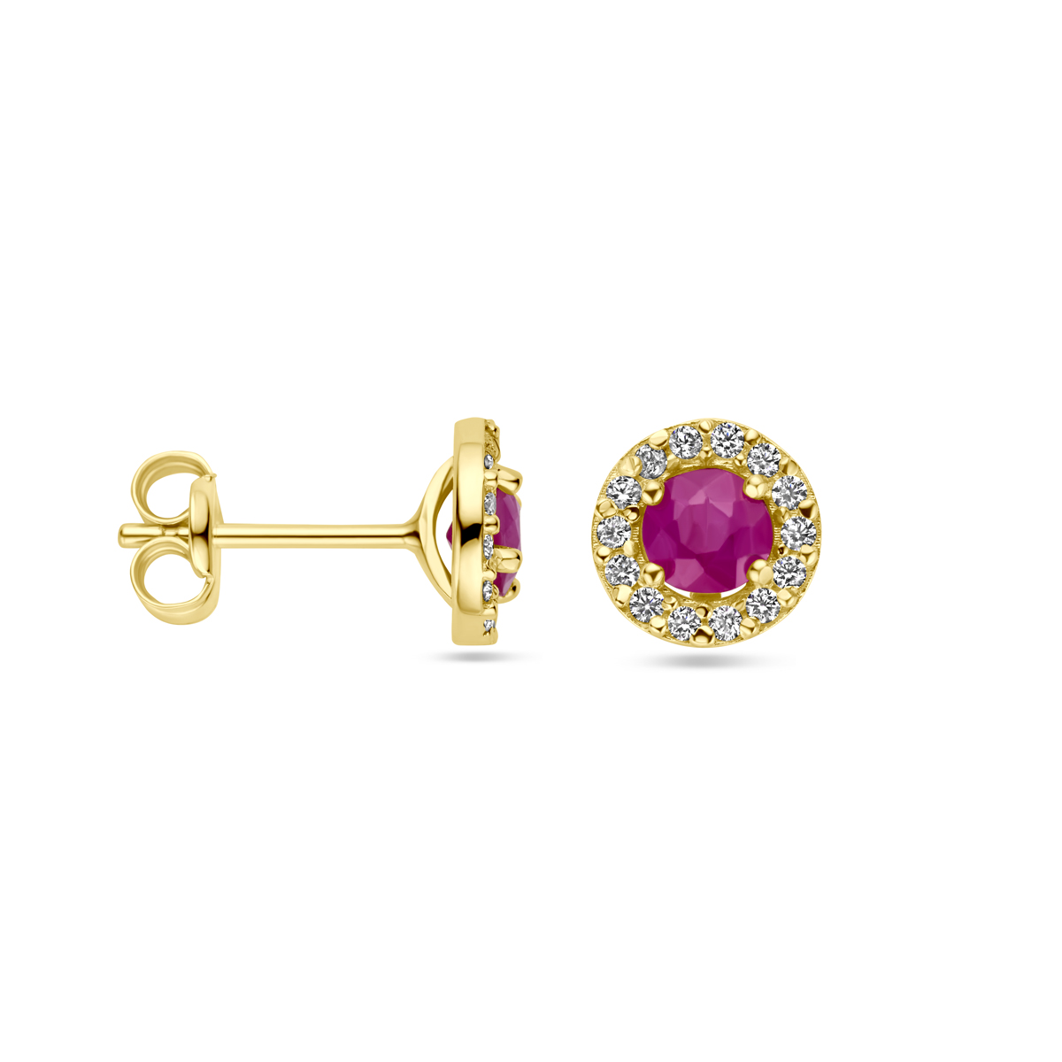 14k Geelgouden oorknoppen uitgevoerd met robijn en zirkonia. De oorknoppen hebben een diameter van 7mm.