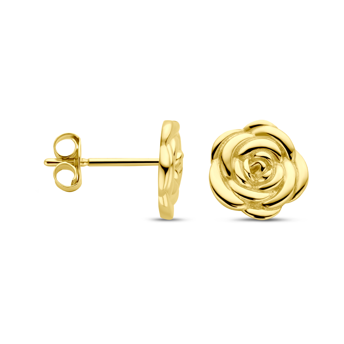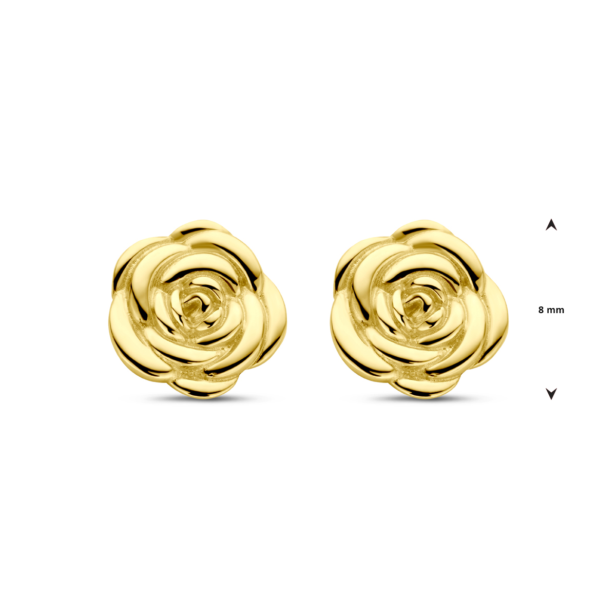 14k Geelgouden oorknoppen uitgevoerd in de vorm van een roos. De oorknoppen hebben een diameter van 8mm.