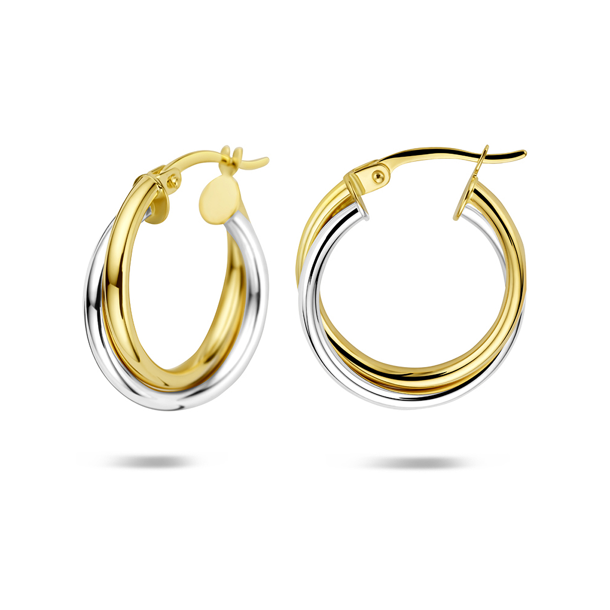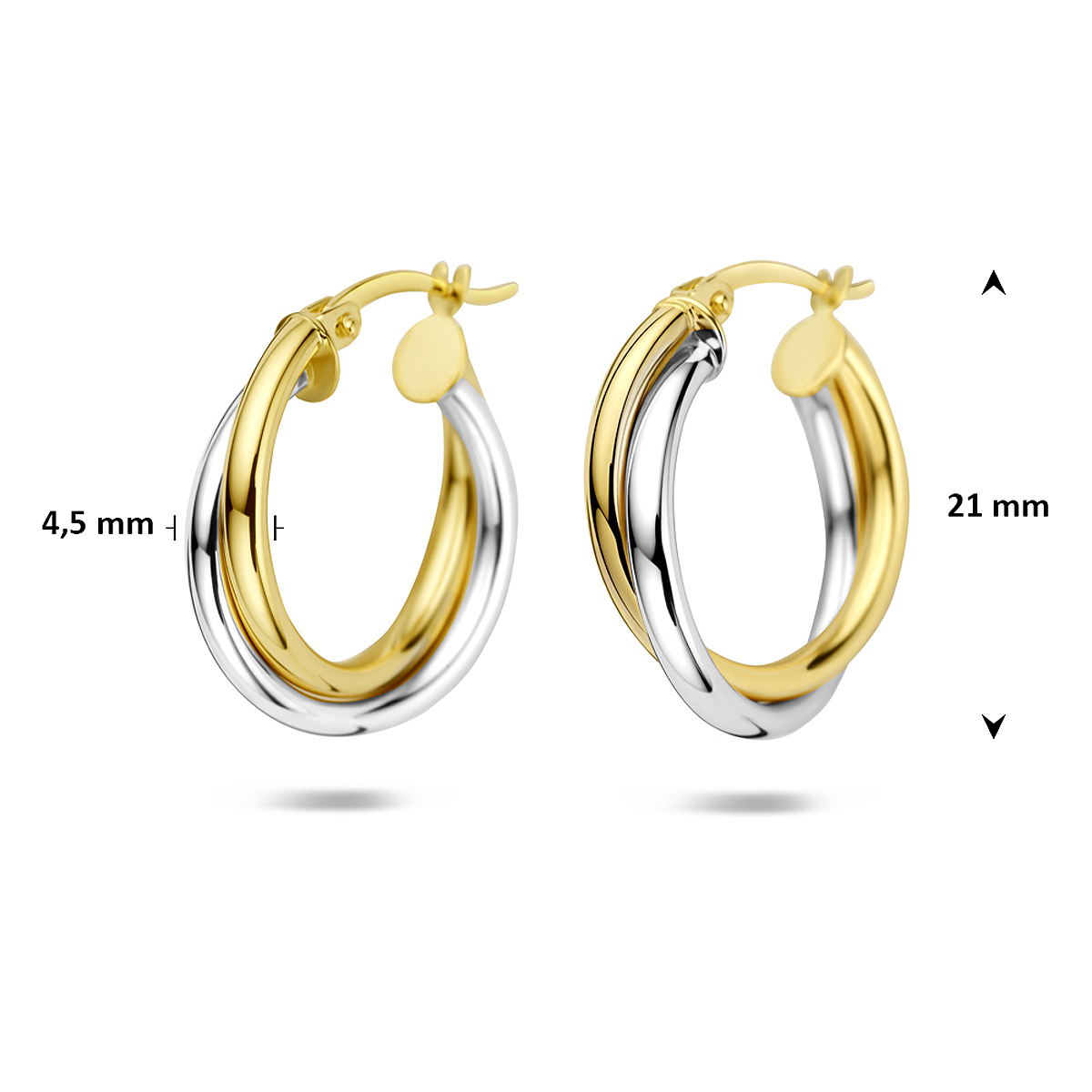 14k Bicolor geel en witgouden oorringen met een afmeting van 21×4.5mm.