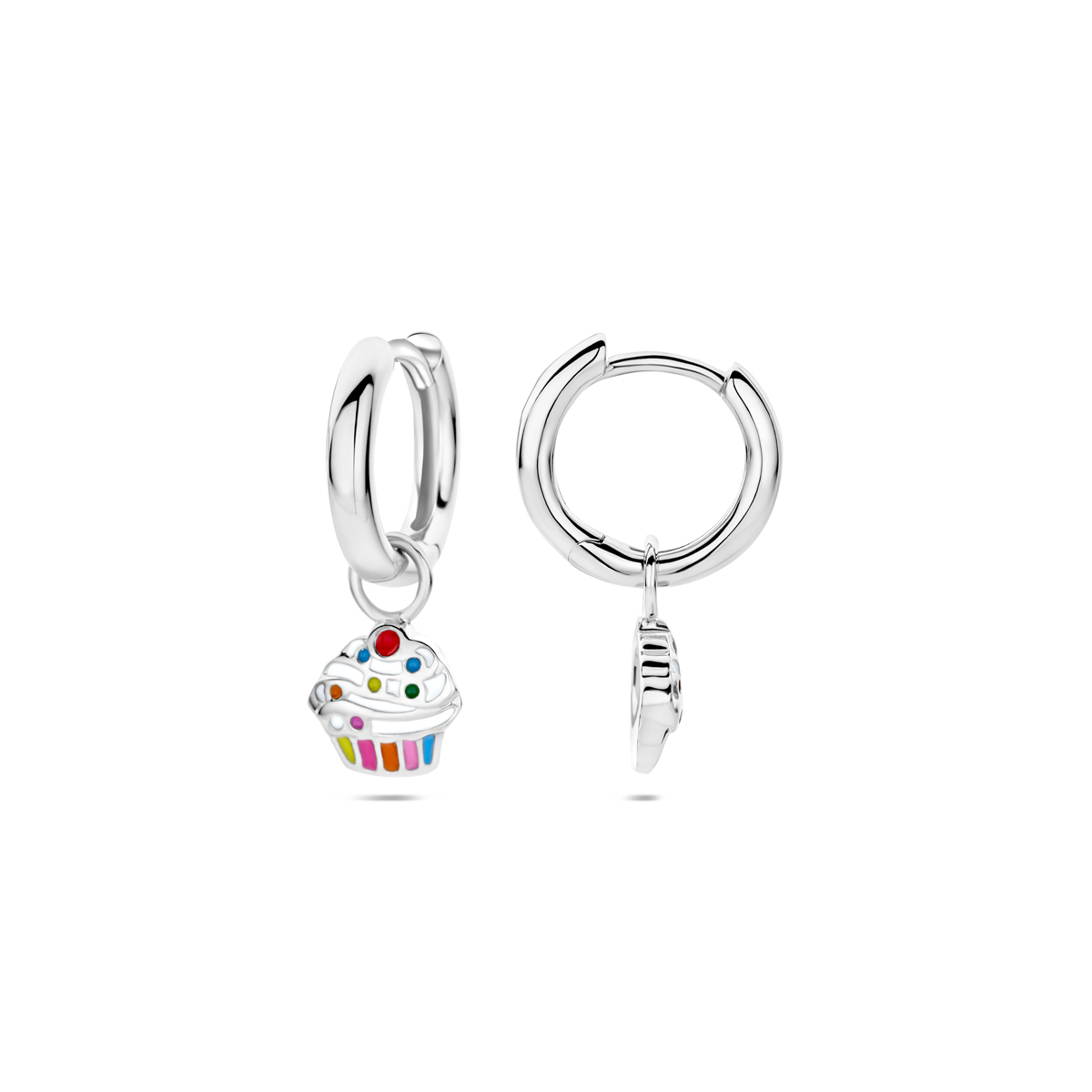 Schattige gerhodineerd zilveren oorringen uitgevoerd met een cupcake hanger in verschillende kleuren emaille. De oorringen hebben een diameter van 12mm.