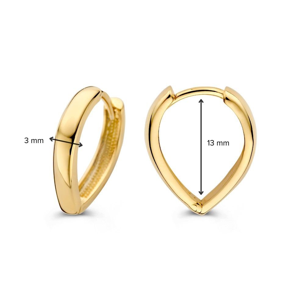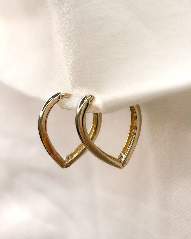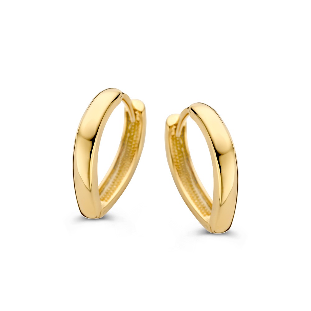 Geelgouden oorrringen die taps toelopen en daardoor een speelse uitstraling in het oor hebben.