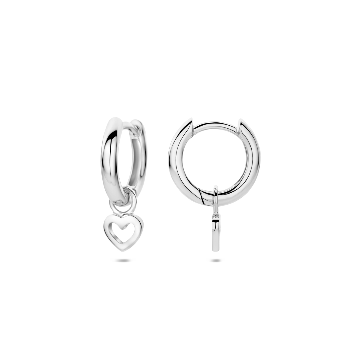 Gerhodineerd 925 zilveren oorringen uitgevoerd met een hangertje in de vorm van een hartje. De oorringen hebben een diameter van 12mm. De hartjes hebben een afmeting van5x5.5mm.