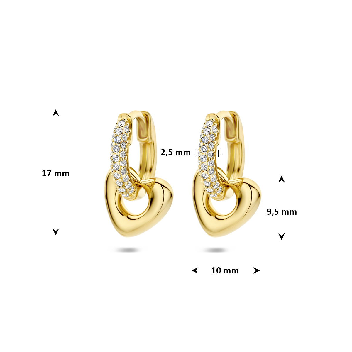 Verguld geel op 925 zilveren oorringen uitgevoerd met zirkonia en een hartje met een totale hoogte van 17mm. De oorringen hebben een afmeting van 13×2.5mm en het hartje van 9.5x10mm. Geen garantie op plating.