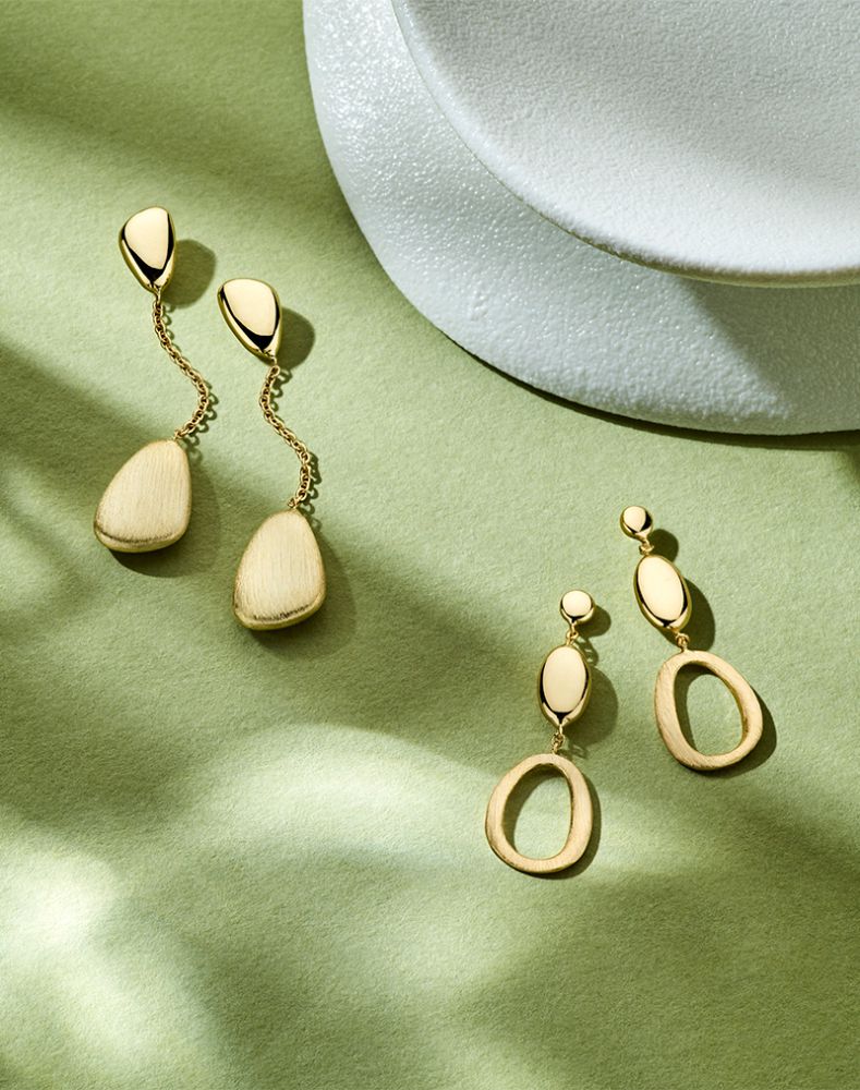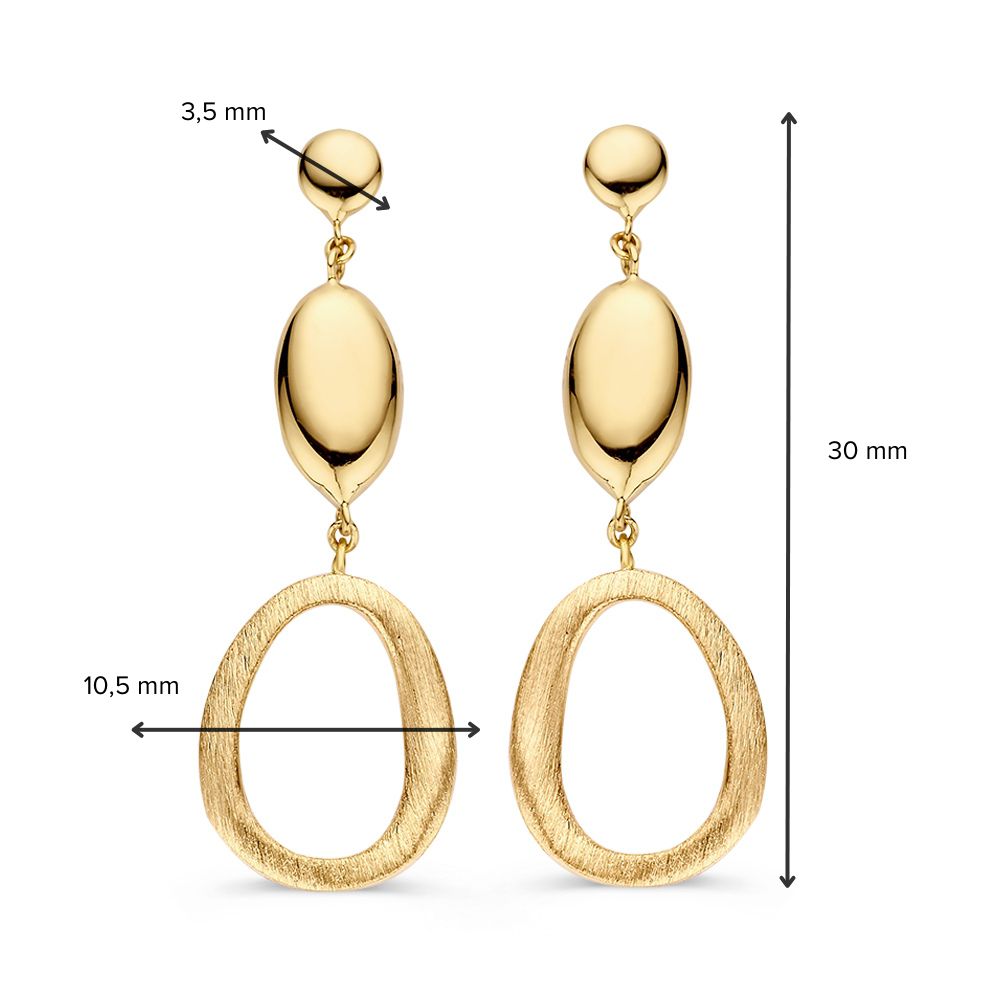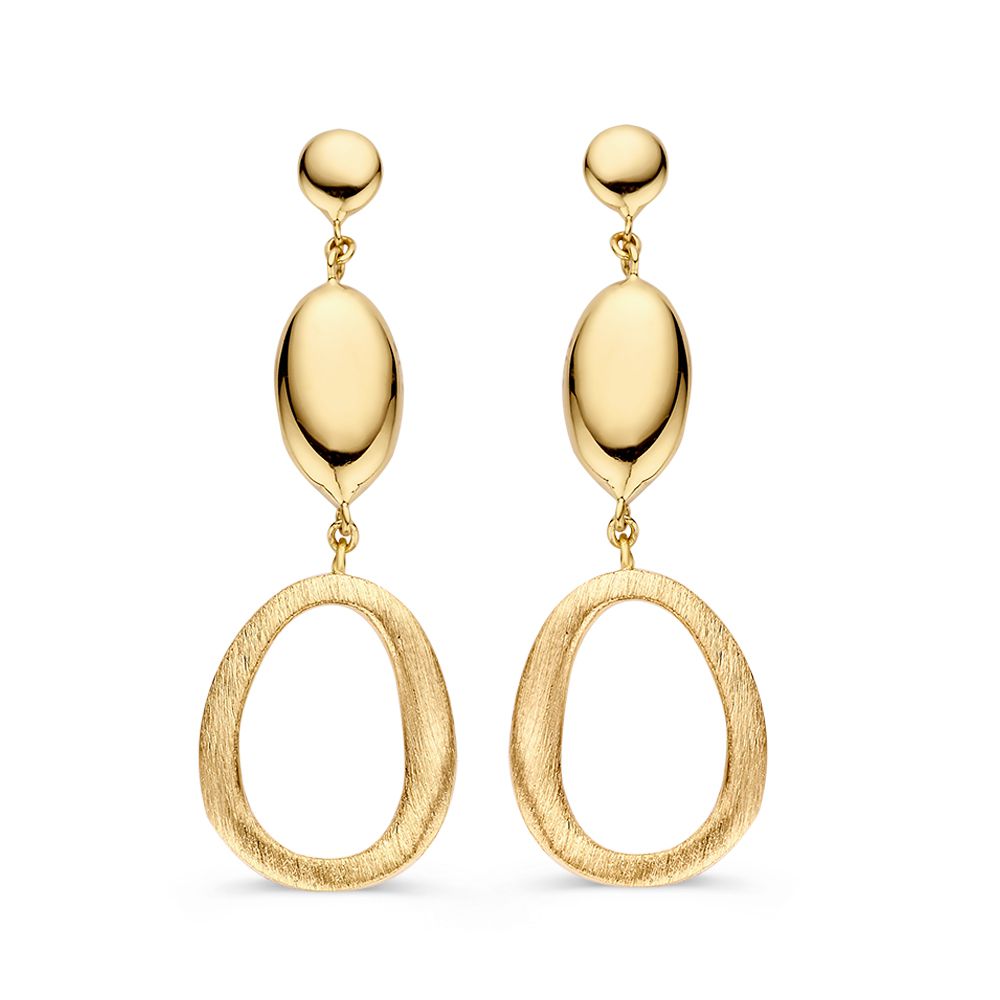 Opvallende geelgouden oorstekers met hangende elementen in organische vormen.