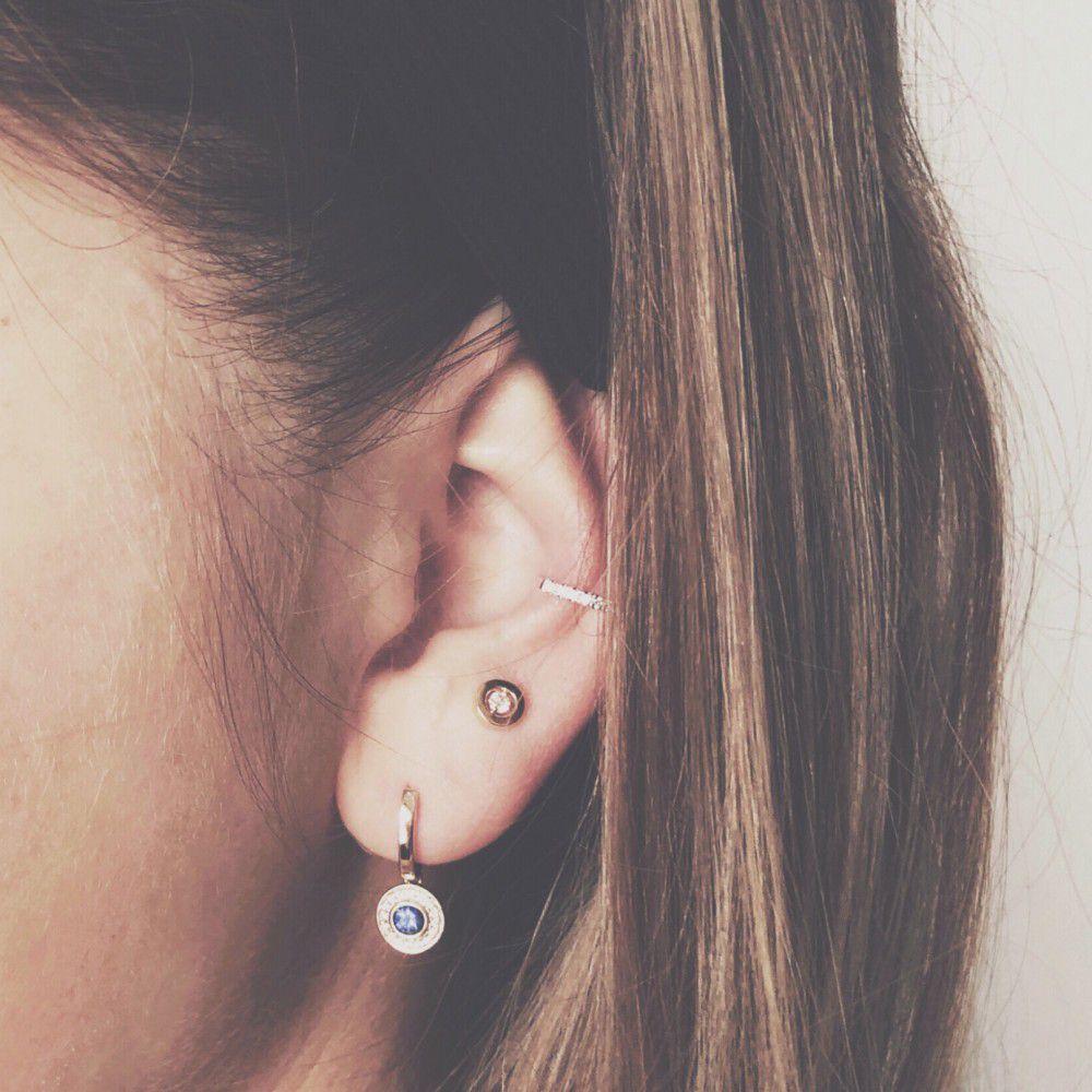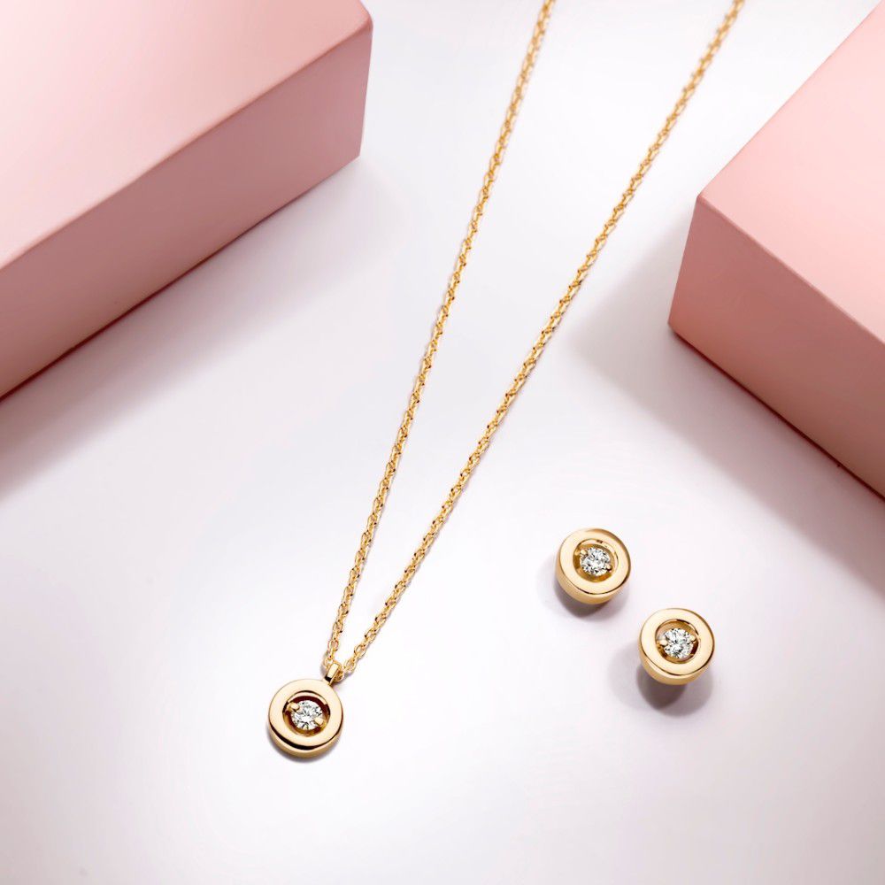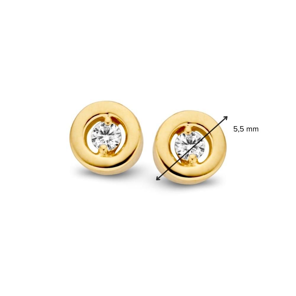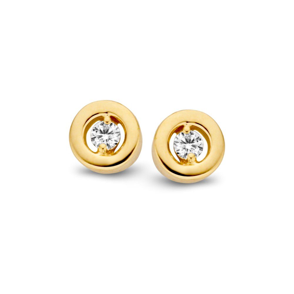 Geelgouden oorstekers met briljant in een strakke zetkast. Deze oorstekers worden geleverd met 14 karaat poussettes.
