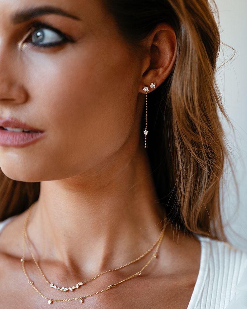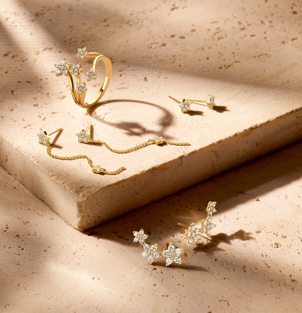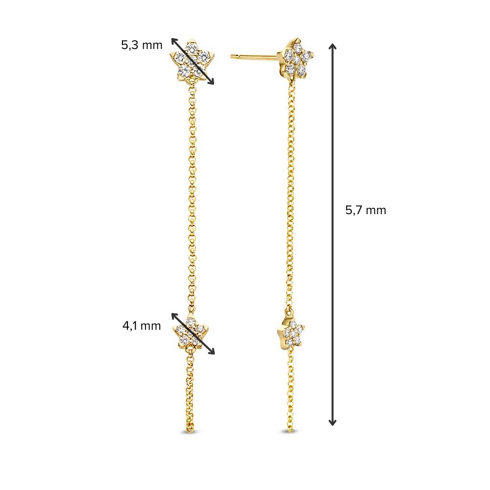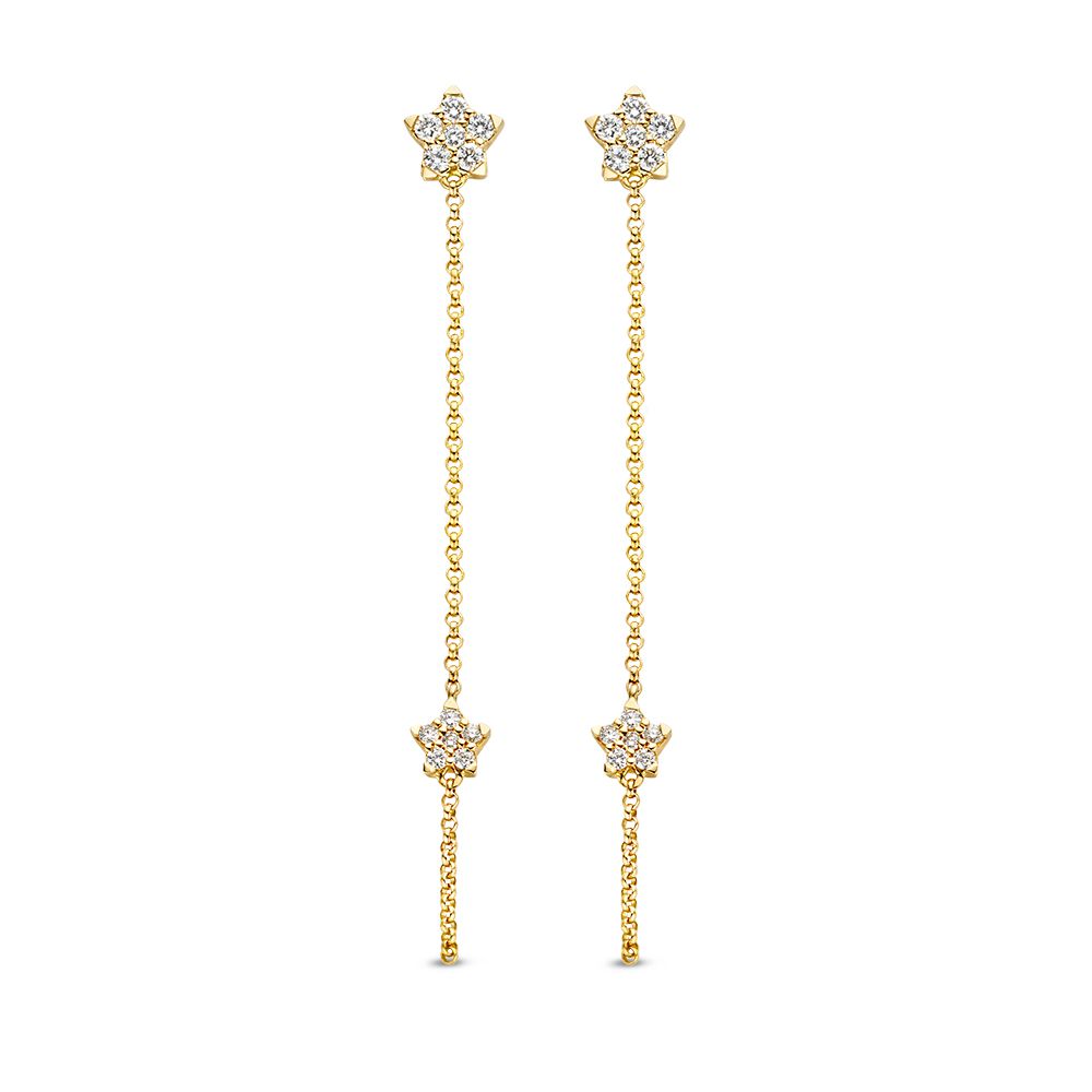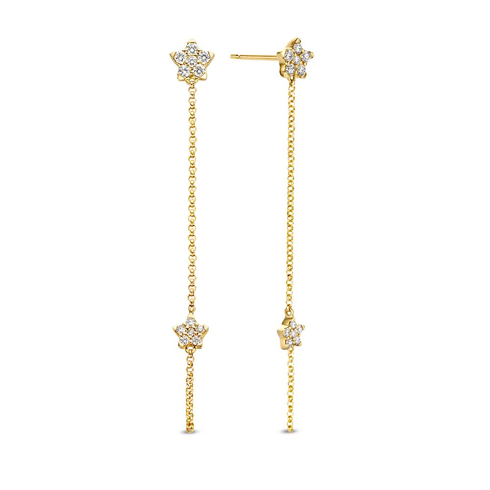 Speelse geelgouden oorbellen met vallende sterren gezet met diamant.