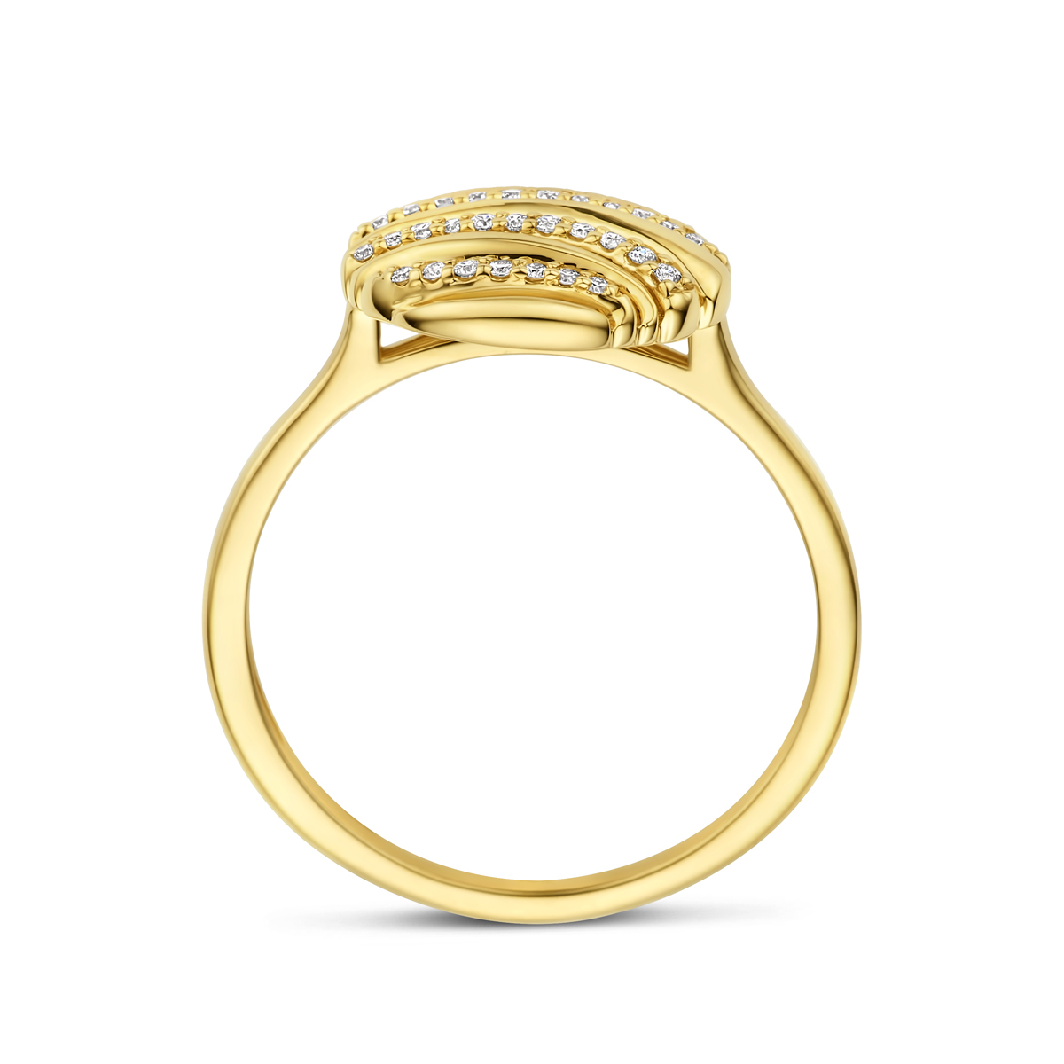 14k Geelgouden ring uitgevoerd met diamant. De ring heeft een diameter van 12mm. Het totale diamantgewicht is 0.09ct.