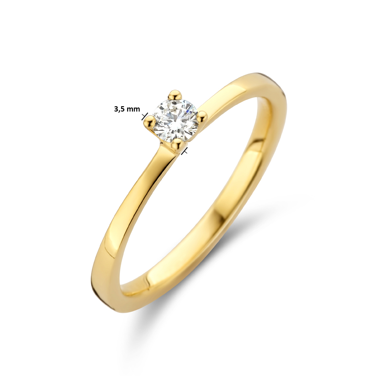 14k Geelgouden ring uitgevoerd met een schitterende diamant. De ring heeft een breedte van 3.5mm.