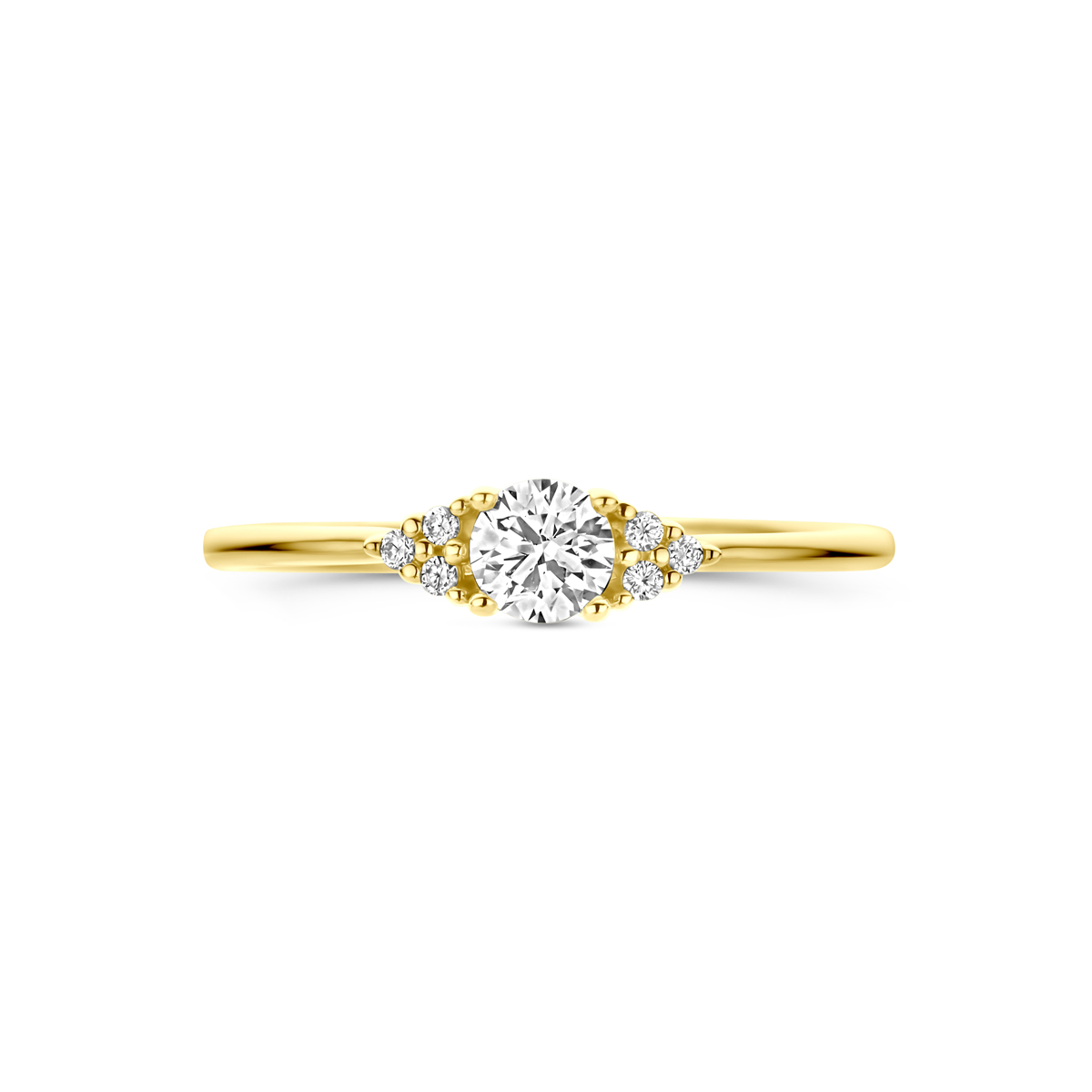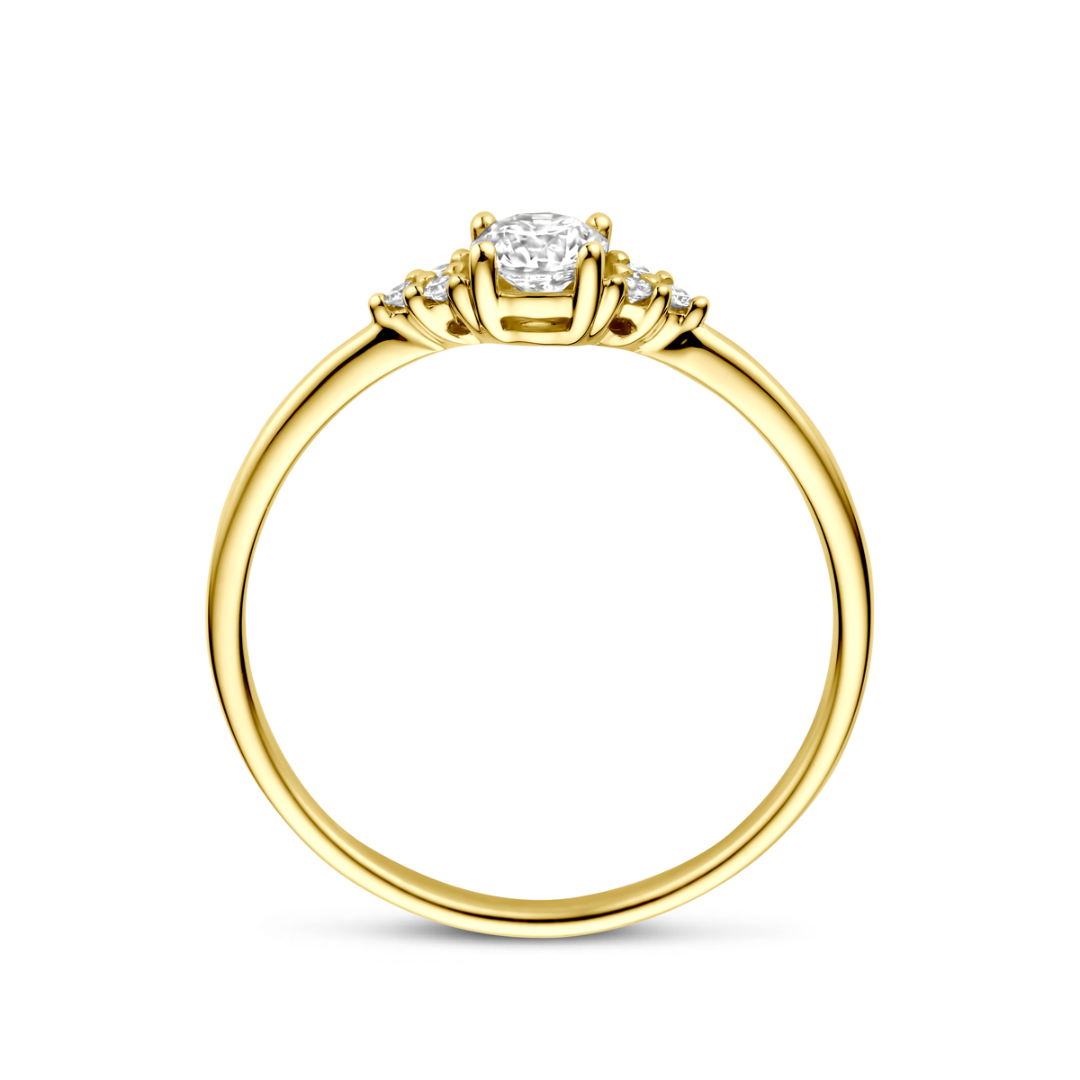 14k Geelgouden ring uitgevoerd met diamant. De steen heeft een diameter van 4mm. Het totale diamantgewicht is 0.28ct.