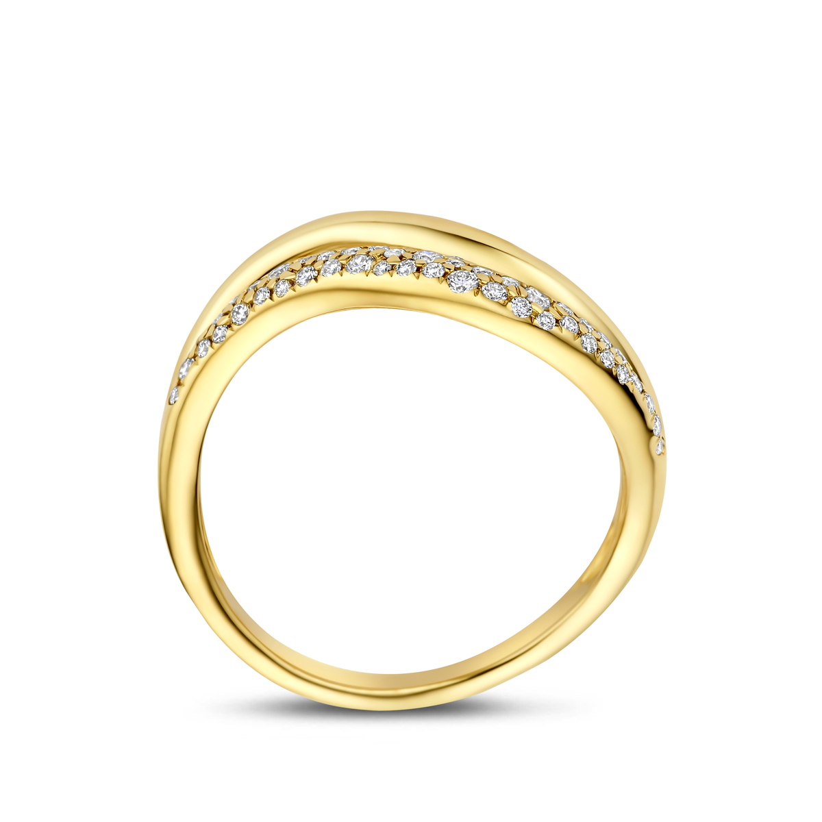 14k Geelgouden ring uitgevoerd met diamant. De ring heeft een breedte van 10.5mm. Het totale diamantgewicht is 0.32ct.